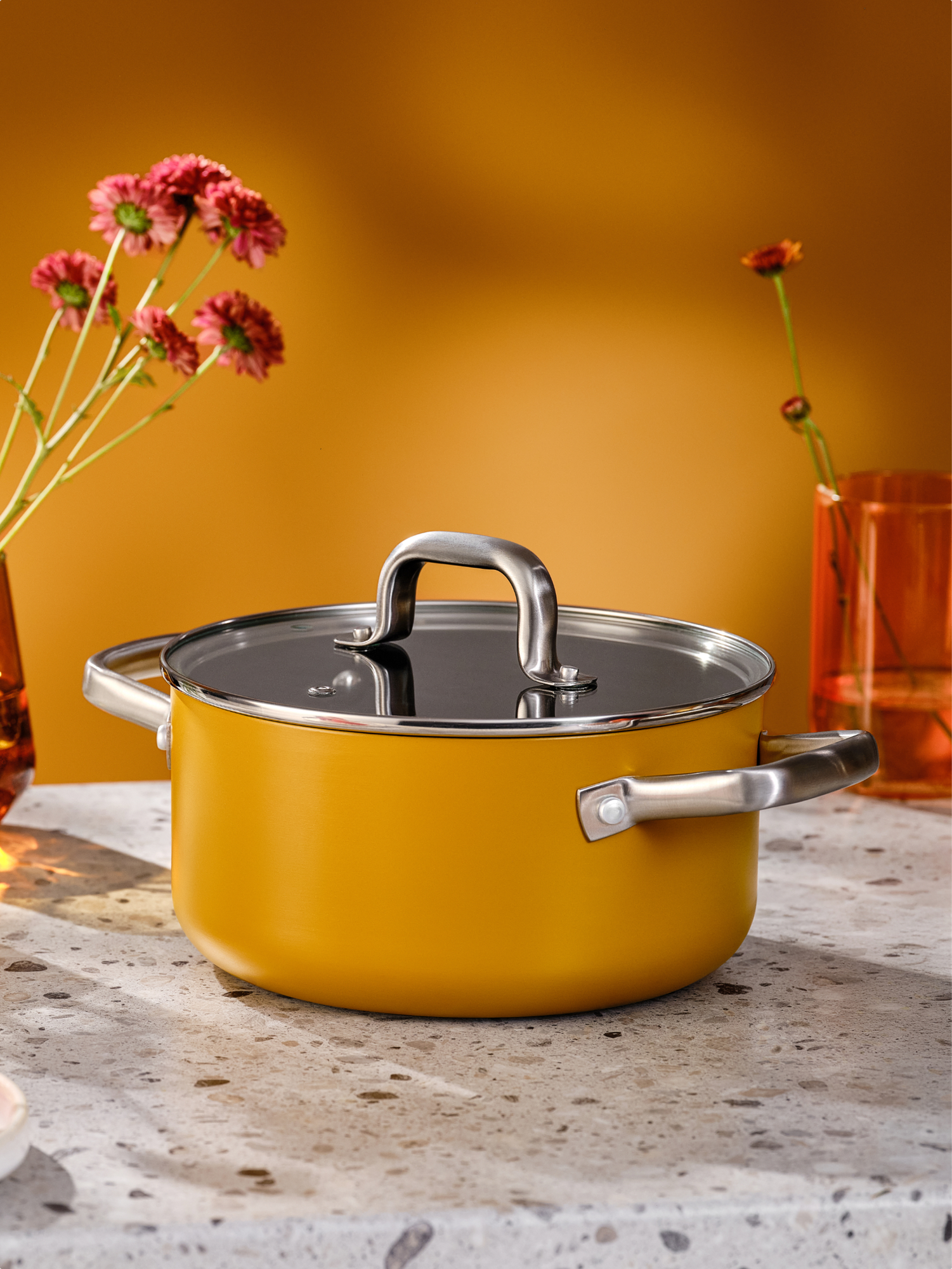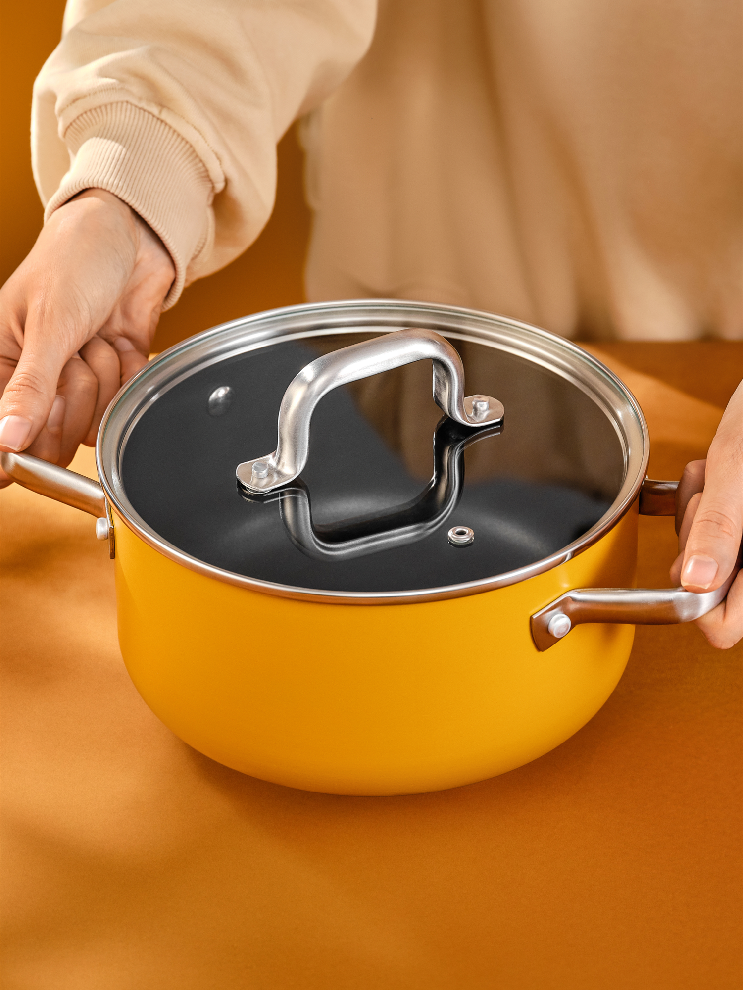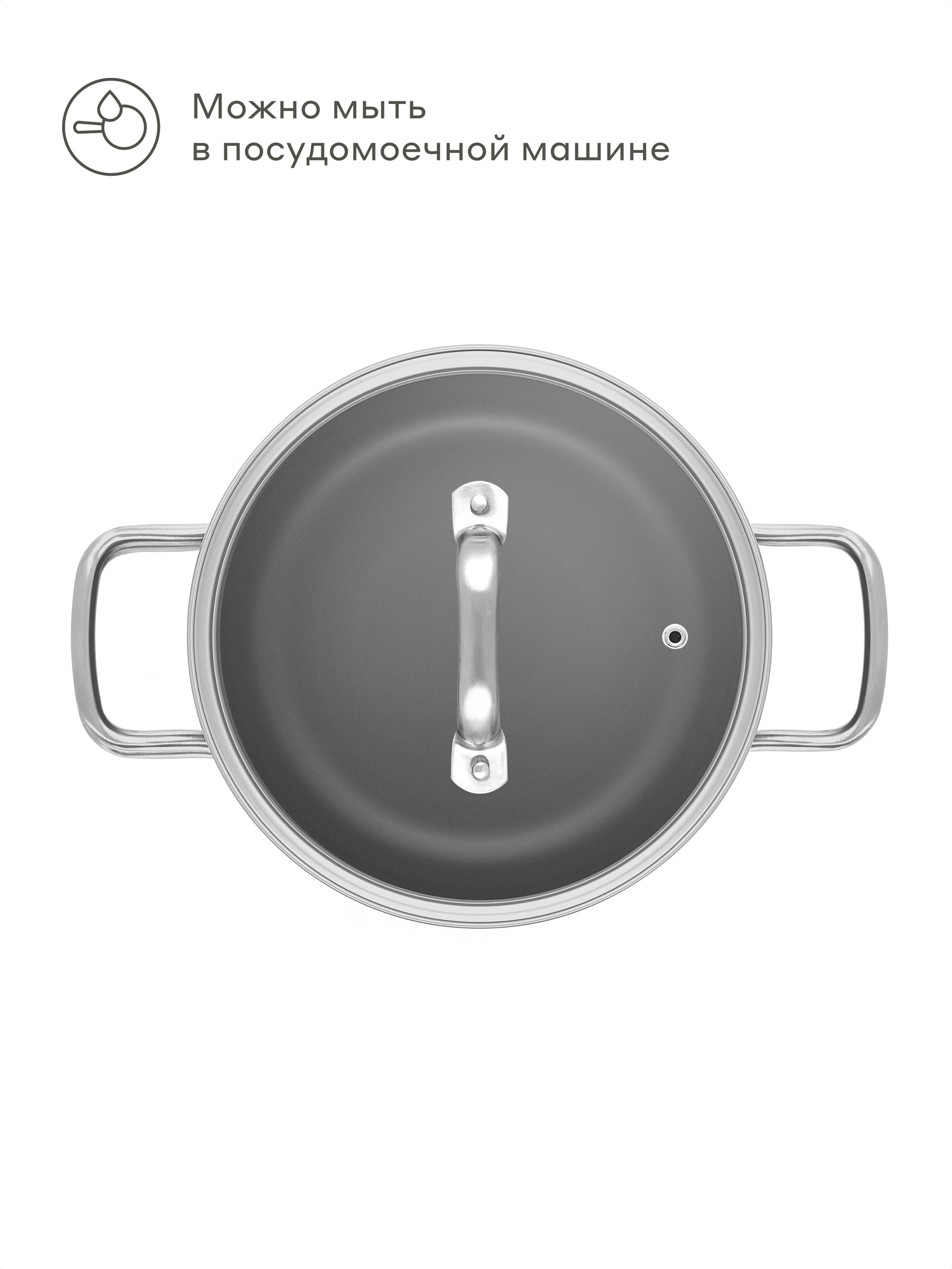 Объем 4.6 л идеален для приготовления первых блюд на семью из 4-5 человек. При закипании 3 л воды на индукционной плите мощностью 2000 Вт достигает точки кипения за 4 минуты 20 секунд (тест Cook's Illustrated). Форма стенок предотвращает выплескивание жидкости при интенсивном кипении.