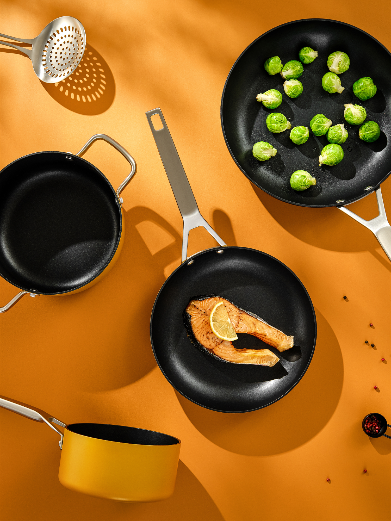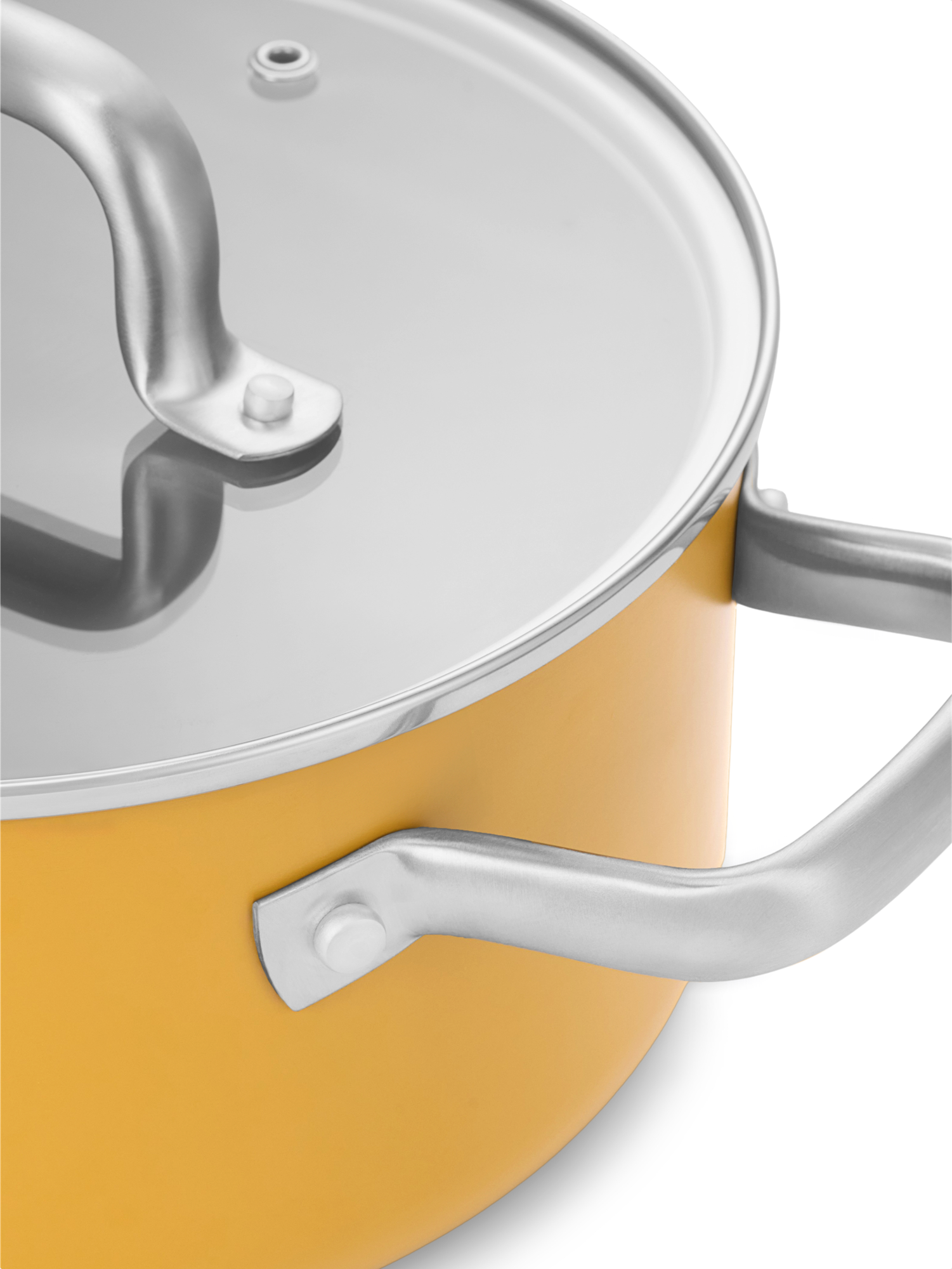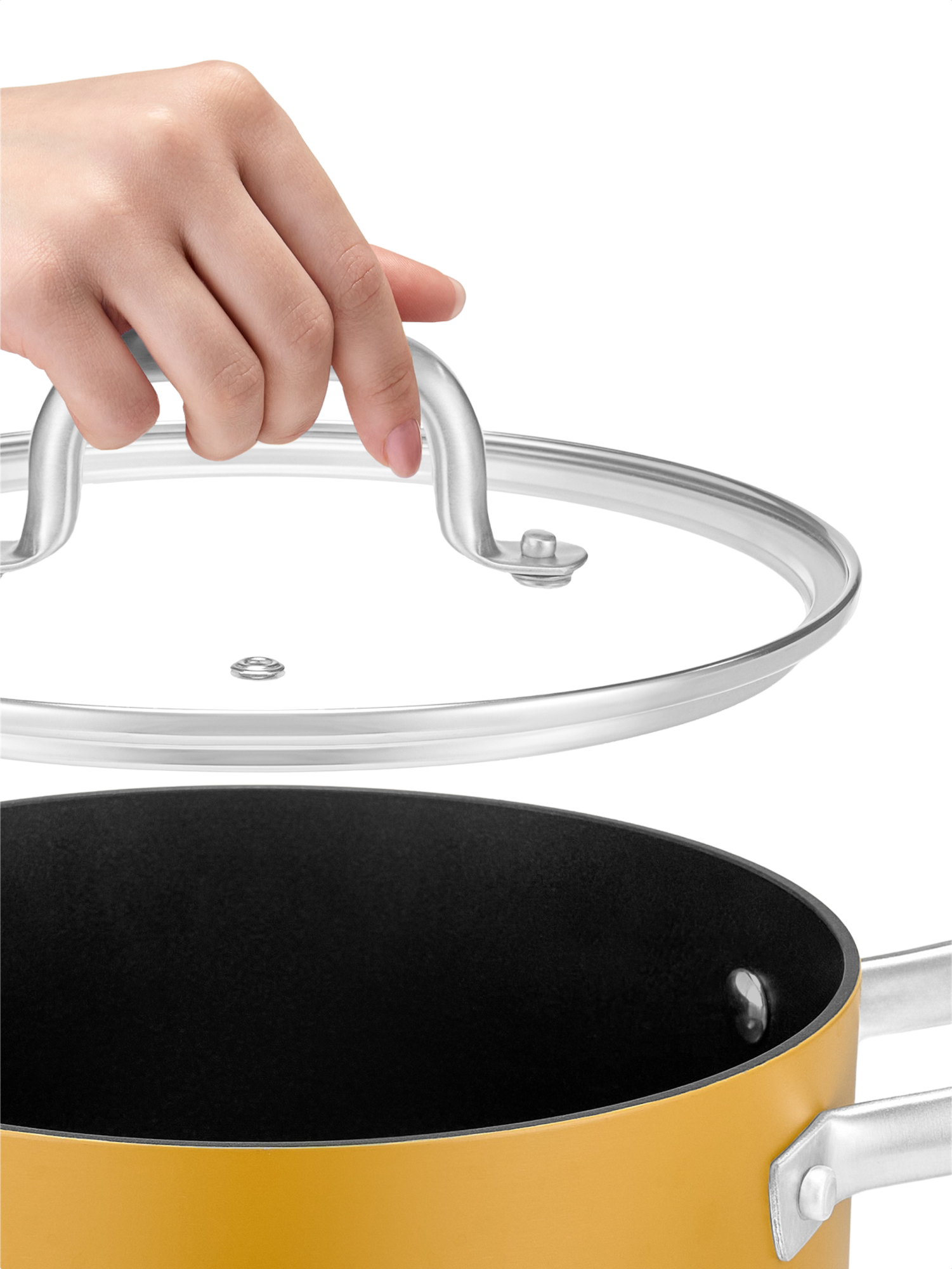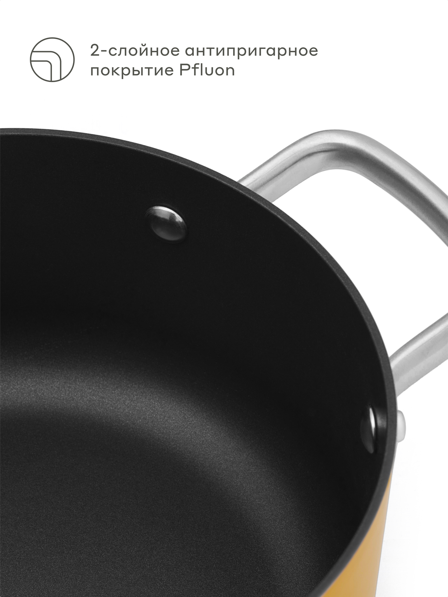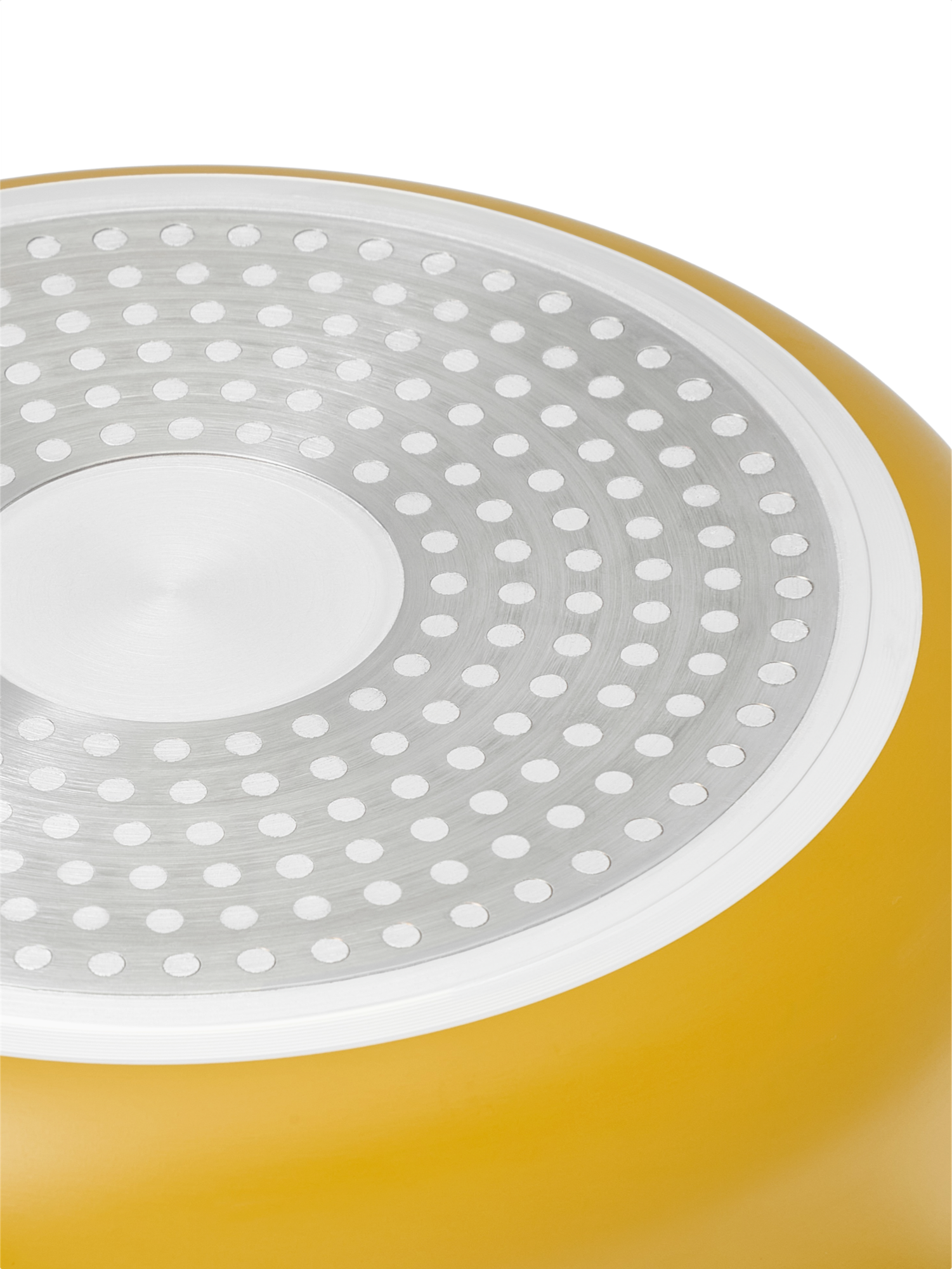 Алюминиевый корпус Pragma Robuk изготовлен методом литья под давлением с толщиной стенок 3.2 мм. Многослойное дно 6.8 мм обеспечивает оптимальное распределение тепла на индукционных плитах. Трехслойное антипригарное покрытие Granitum Pro (основа - мраморная крошка) выдерживает до 25 000 циклов нагрева по тестам SGS.