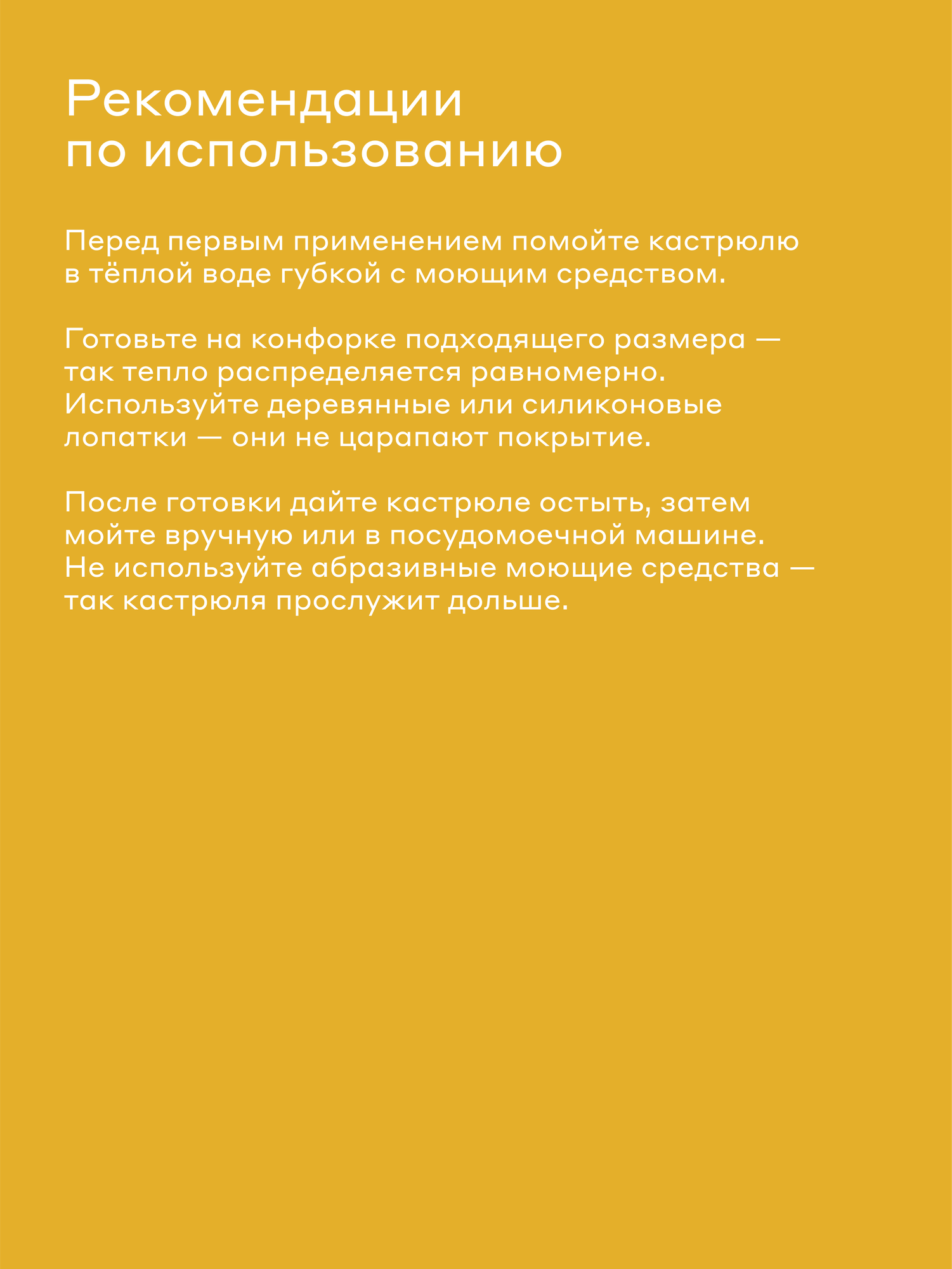Разрешается мытье в посудомоечной машине при температуре до 65°C. Для удаления сложных загрязнений используйте пасту из пищевой соды и воды. Не применяйте абразивные чистящие средства – они повреждают защитный слой покрытия. После мытья протирайте дно насухо.