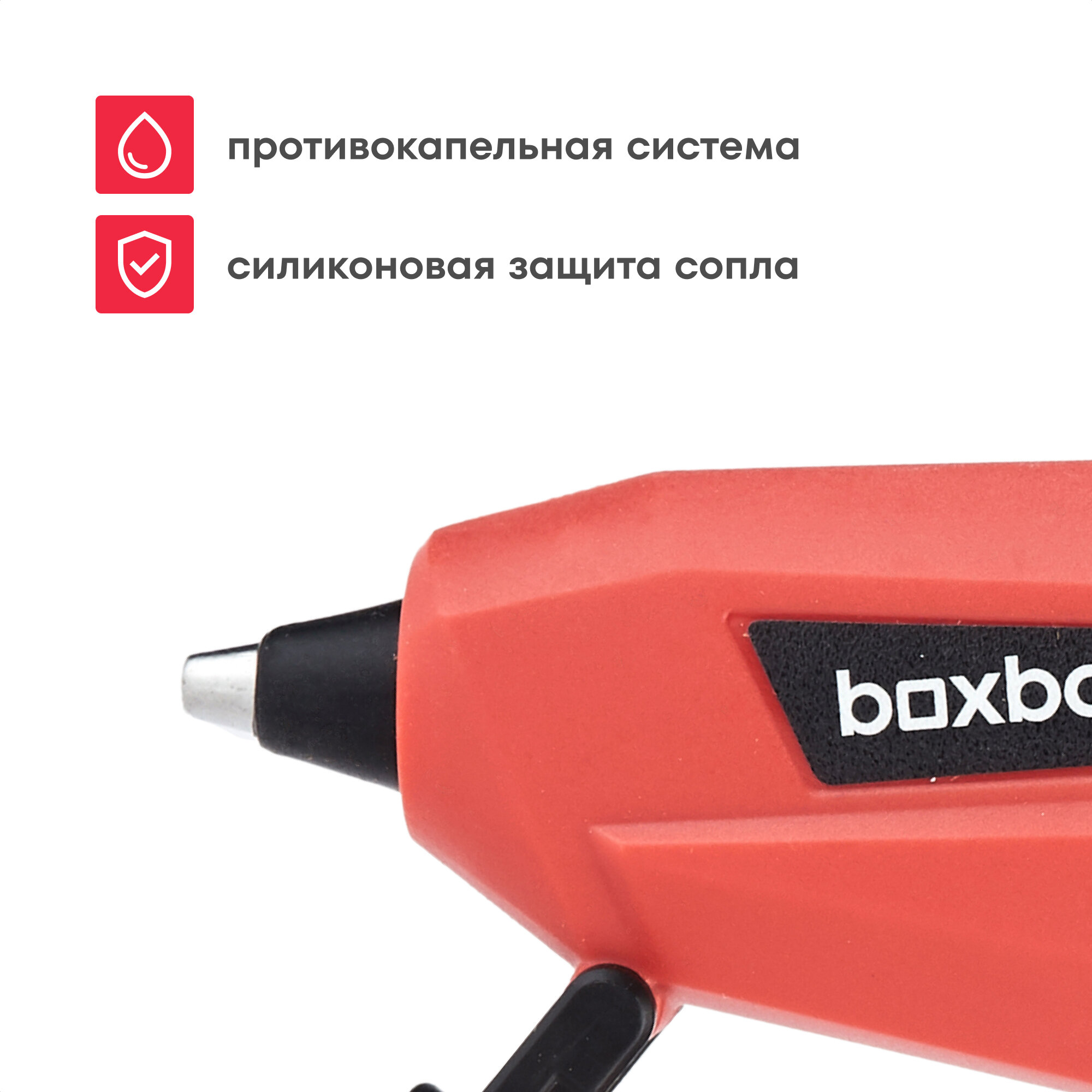 Клеевой пистолет Boxbot EG-7 имеет мощность нагрева 100 Вт с температурой плавления до 165°C. Работает со стандартными клеевыми стержнями диаметром 7 мм, которые плавятся за 150 секунд. В отличие от моделей конкурентов, потребляет на 15% меньше электроэнергии при одинаковой производительности.