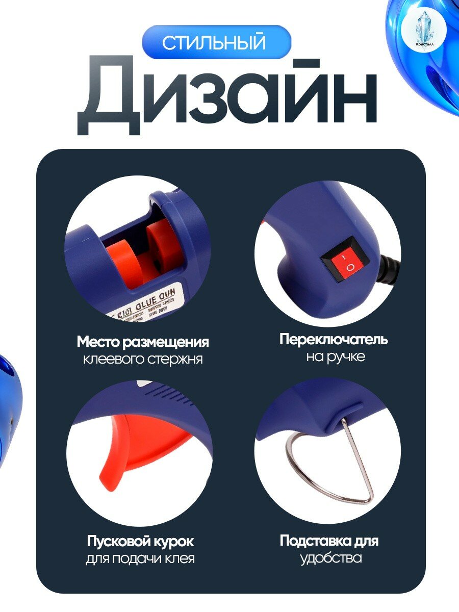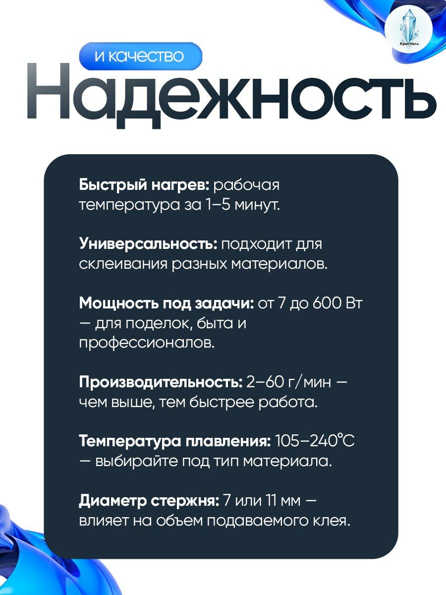 Профессиональный инструмент для творческих задач обеспечивает температуру плавления до 200°C. В отличие от бюджетных аналогов с нагревом 300+ секунд, наша модель готова к работе за 240 секунд благодаря керамическому нагревательному элементу. Диаметр совместимых расходников - 7 мм, что оптимально для точного нанесения.