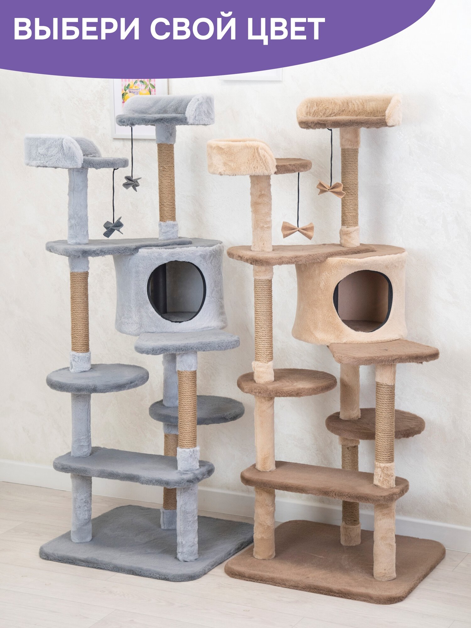 - Двухслойное покрытие стоек: джутовые когтеточные поверхности с износостойкими характеристиками и меховые зоны отдыха на платформах верхних ярусов