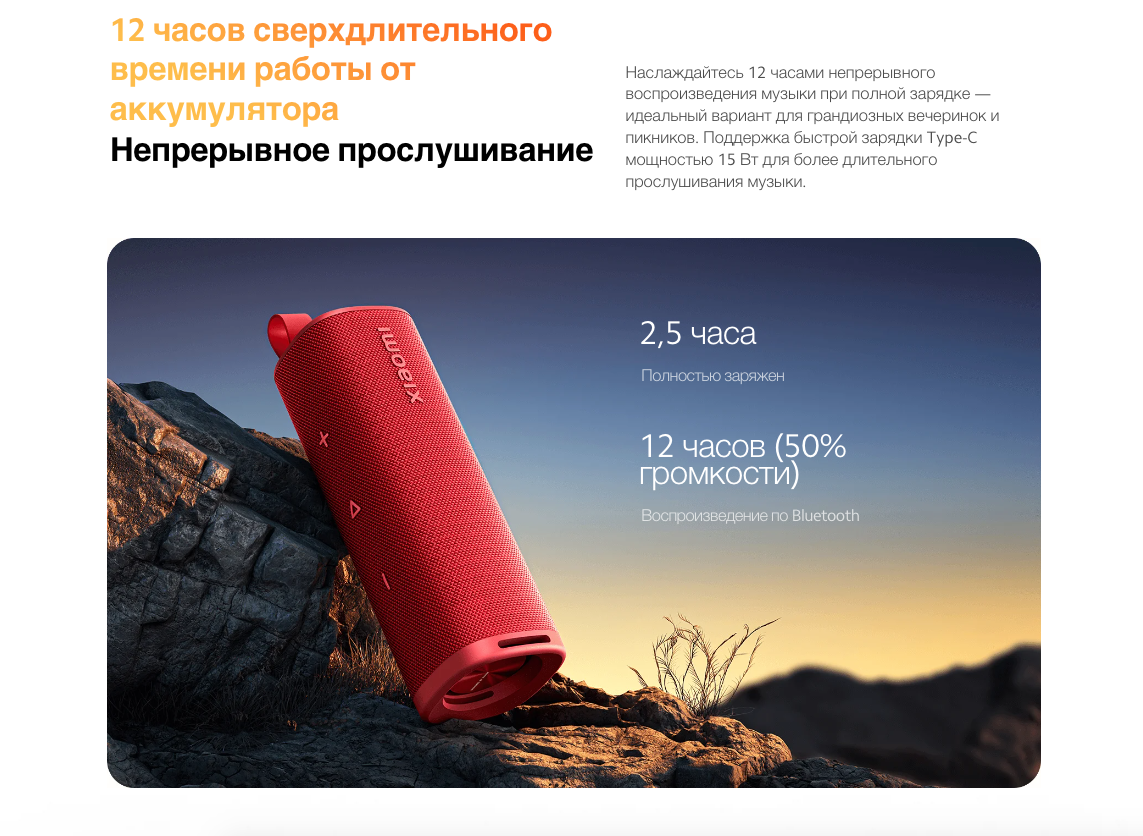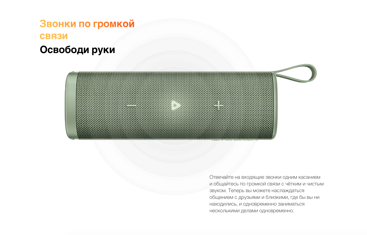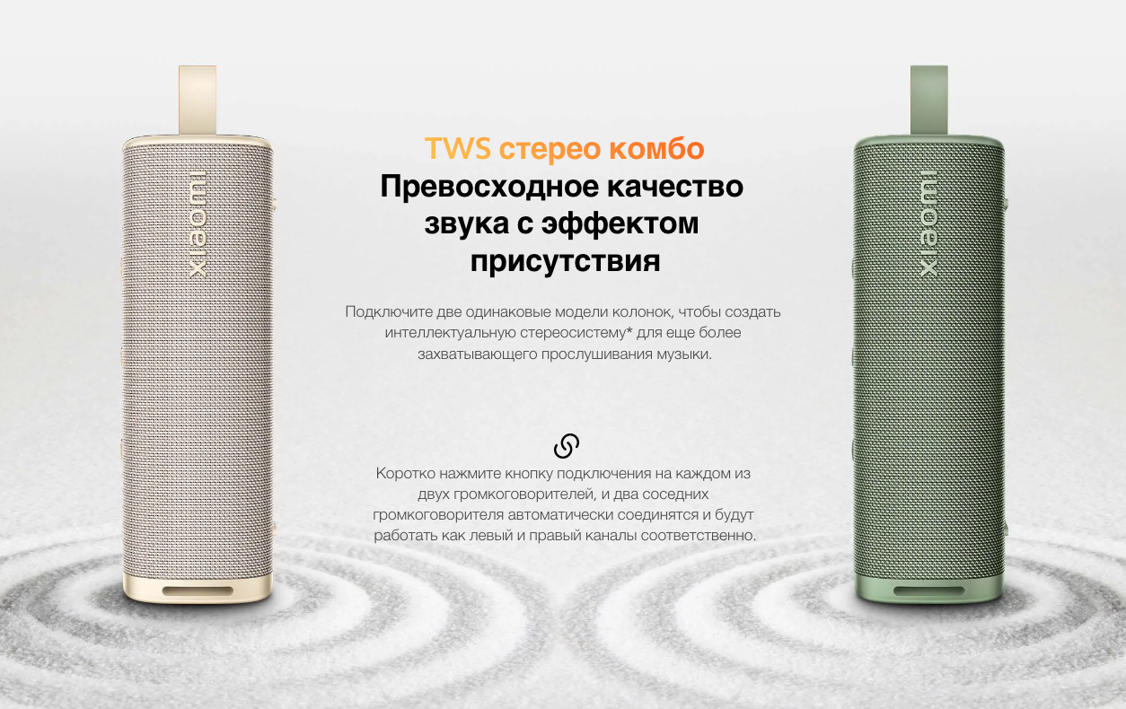 Стереозвук Xiaomi Sound Outdoor создает эффект присутствия благодаря двойным динамикам с суммарной мощностью 30Вт RMS. Технология Bass Enhancement усиливает низкие частоты для танцевальных треков.