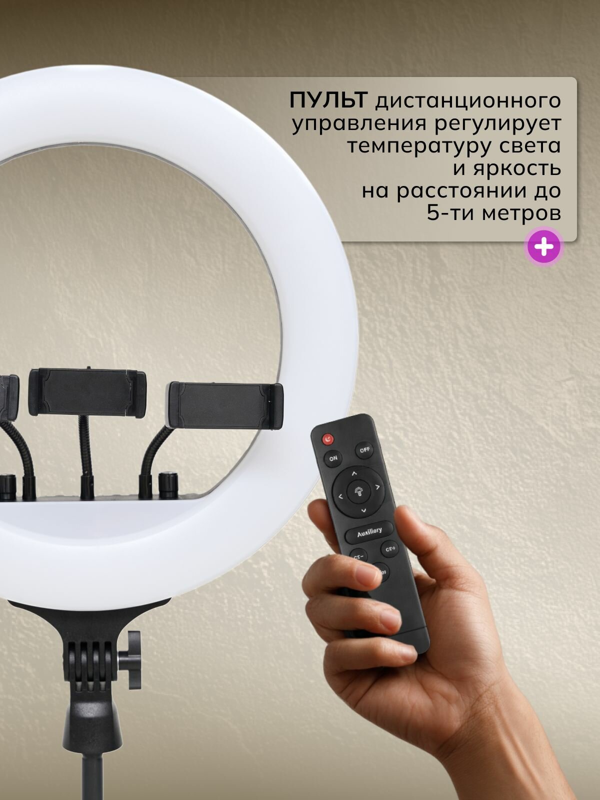 Светодиодный кольцевой источник диаметром 36 см создает равномерное освещение без теней - идеальный выбор для портретных съемок и видеоблогинга. Световой поток 2500 люмен обеспечивает яркую подсветку при потреблении всего 28 Вт, что в 3 раза экономичнее люминесцентных аналогов.