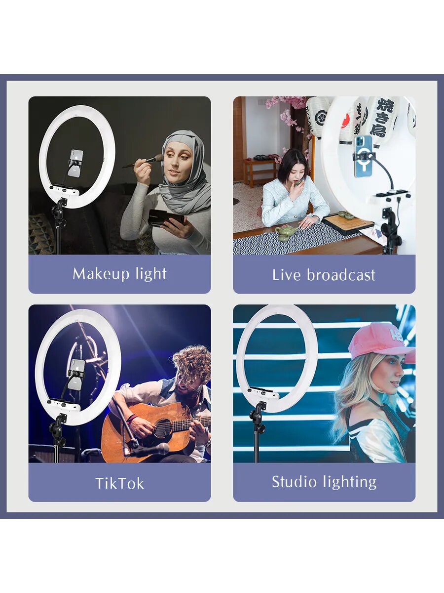 Световой модуль 48 см генерирует равномерную подсветку без теней благодаря 480 LED диодам. Диаметр охватывает пространство до 1.5 метров - оптимально для портретной съемки и нанесения макияжа. Цветовая температура регулируется от 3000K (теплый желтый) до 6000K (холодный белый) через сенсорную панель или пульт ДУ.