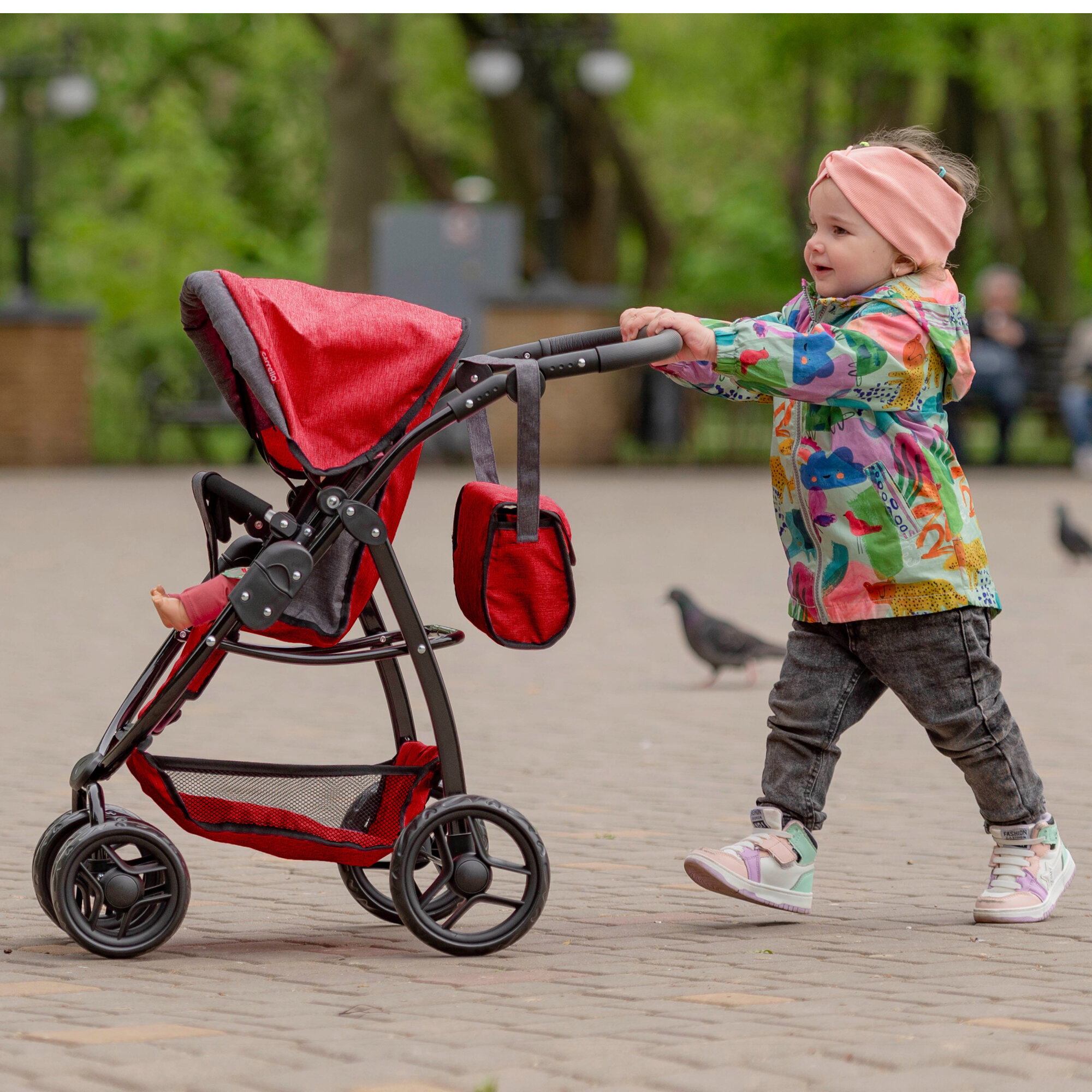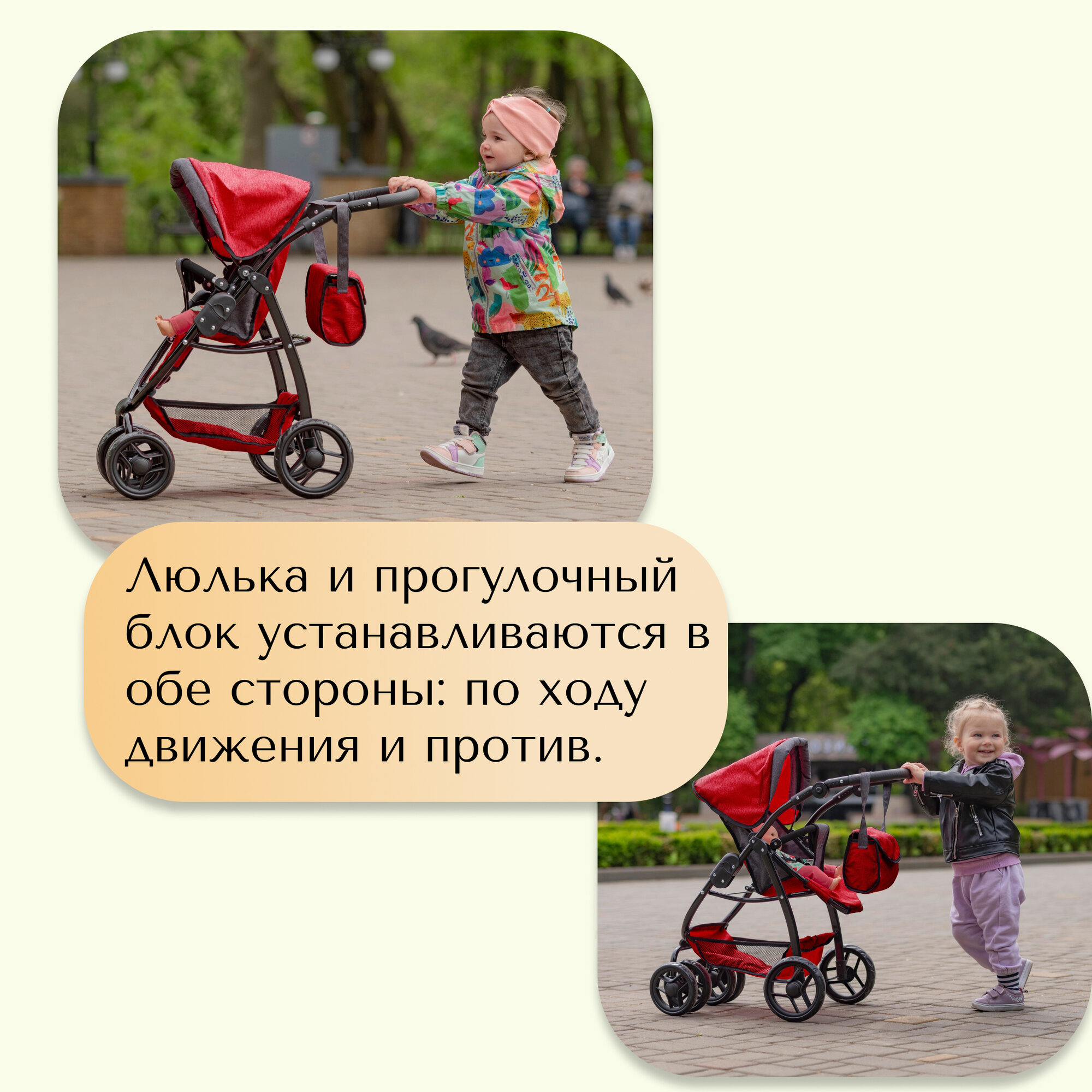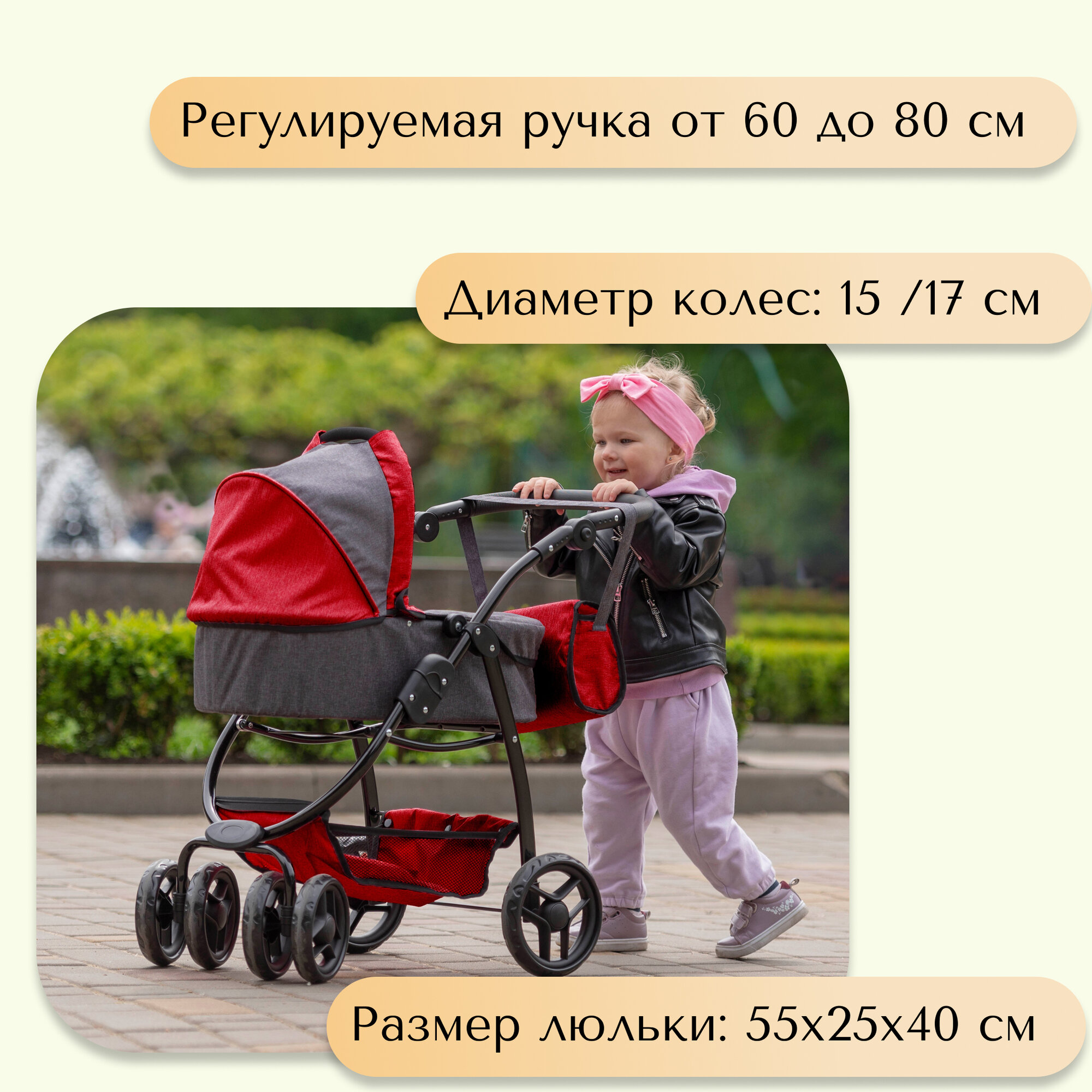- Режим люльки (52x32 см) с навесным капюшоном создает защищенное пространство для кукол