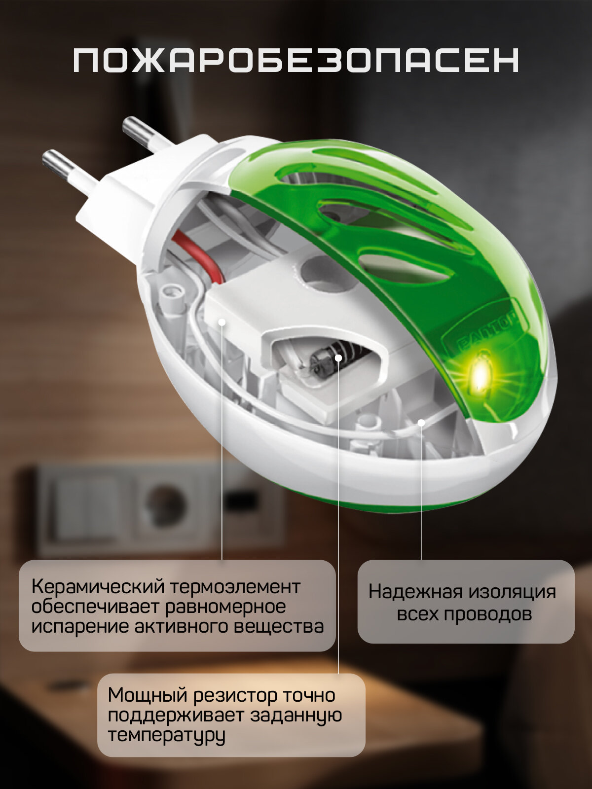 Набор Раптор повышенной эффективности обеспечивает круглосуточную защиту помещения до 20 м² благодаря сочетанию запатентованной формулы жидкости и электронного нагревателя. Фумигатор работает от сети 220 В без перерыва до 30 суток, потребляя минимум электроэнергии — суточное потребление сопоставимо с работой 12-ваттной LED-лампы. Технология мембранного испарения исключает перегрев активных веществ, что гарантирует: