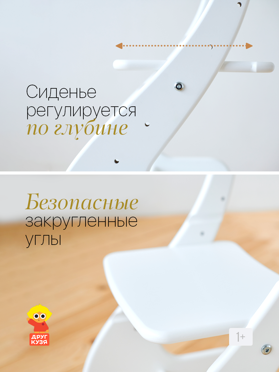 Набор растущей мебели Друг Кузя решает основную проблему родителей – необходимость ежегодно менять детскую мебель. Регулировочные механизмы стула позволяют изменять высоту сиденья и глубину посадки в 6 положениях, адаптируя конструкцию под рост от 80 до 120 см.