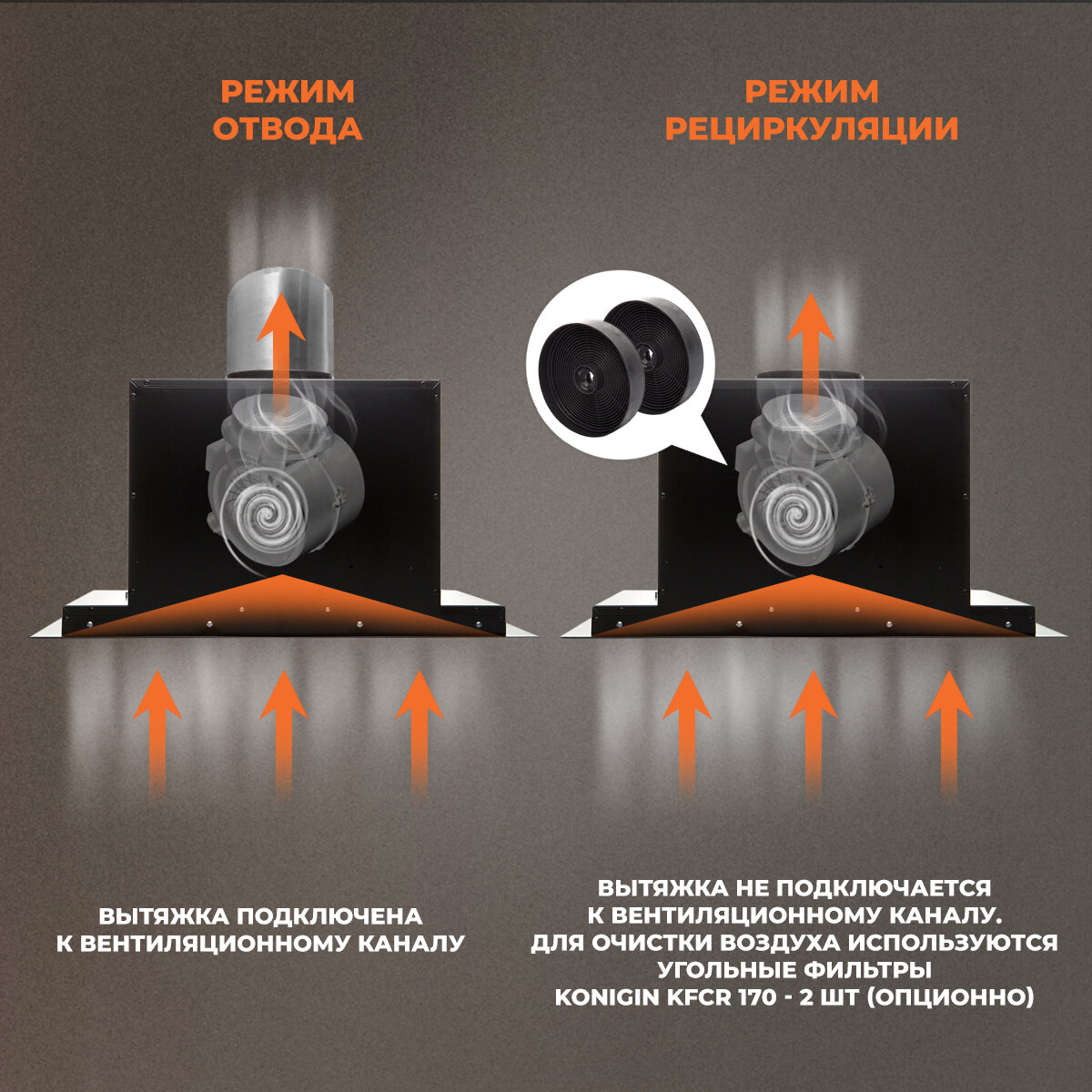 - Двойной режим очистки сочетает отвод воздуха через вентиляцию и циркуляцию через угольные фильтры. Для квартир без воздуховода рекомендуем использовать режим рециркуляции с дополнительной установкой фильтрующего элемента.