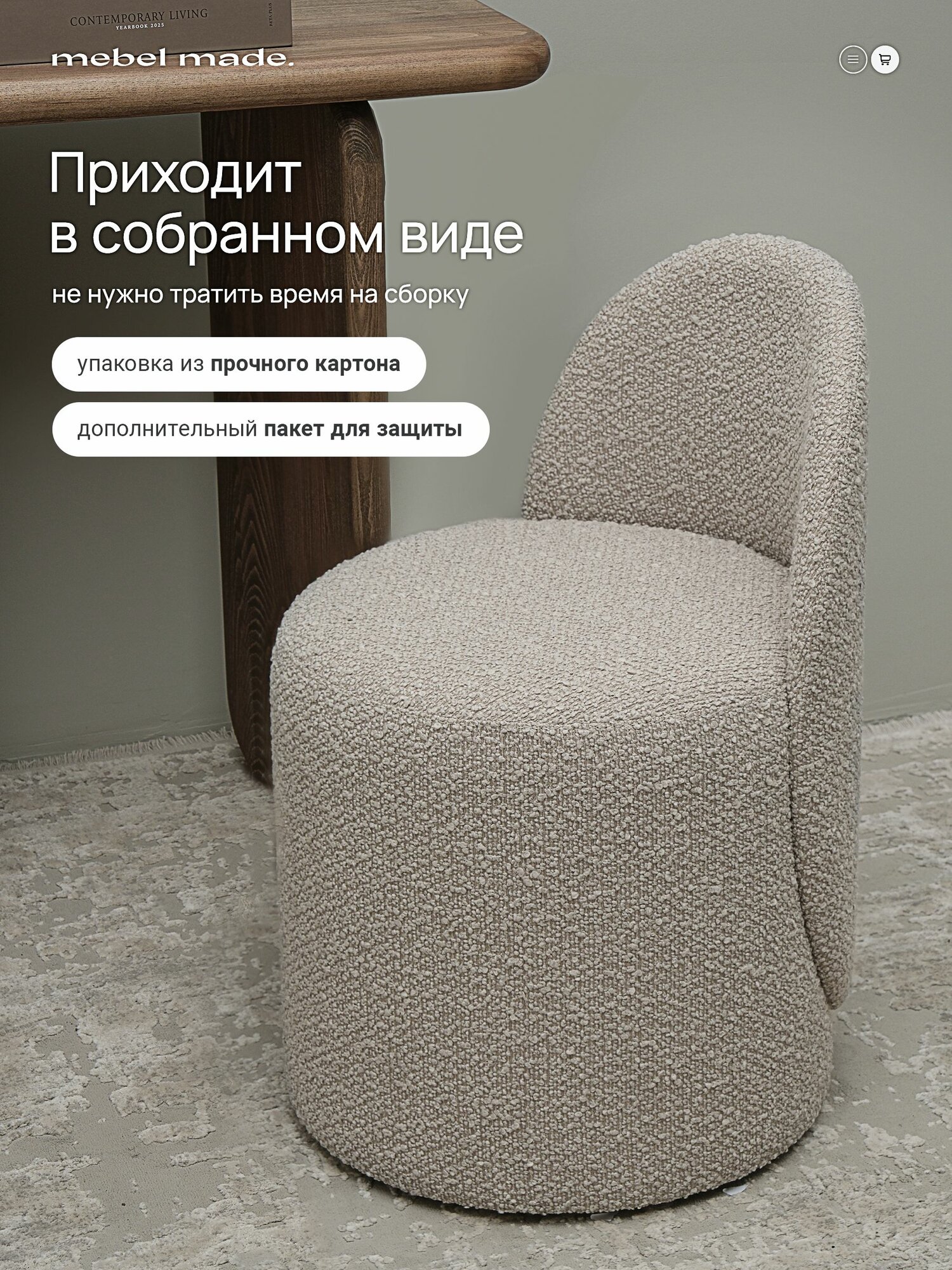 Для Москвы и Санкт-Петербурга доступен самовывоз из шоу-румов с примеркой — среднее время доставки по РФ составляет 4-7 дней. Рассрочка 0% действует на всю коллекцию букле при оплате картой любого банка.