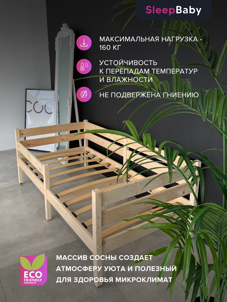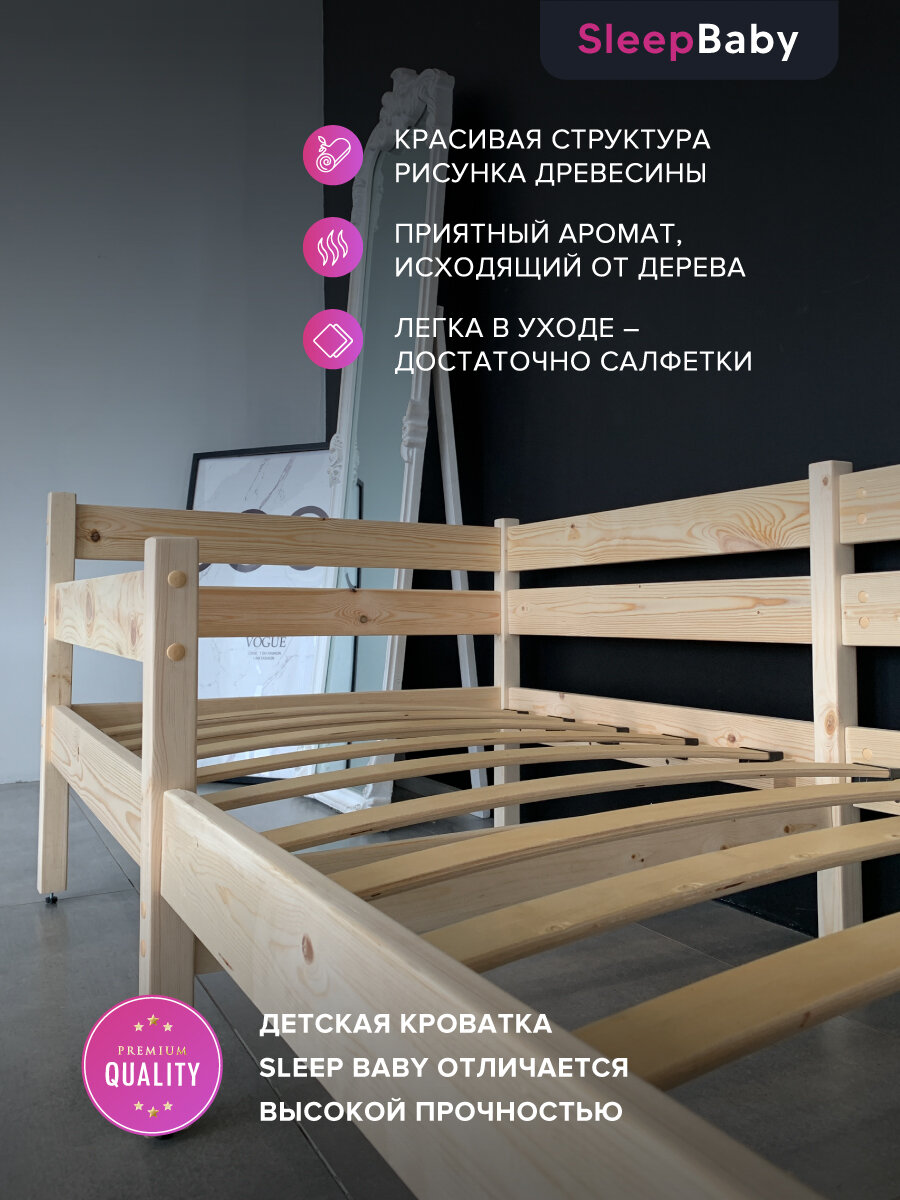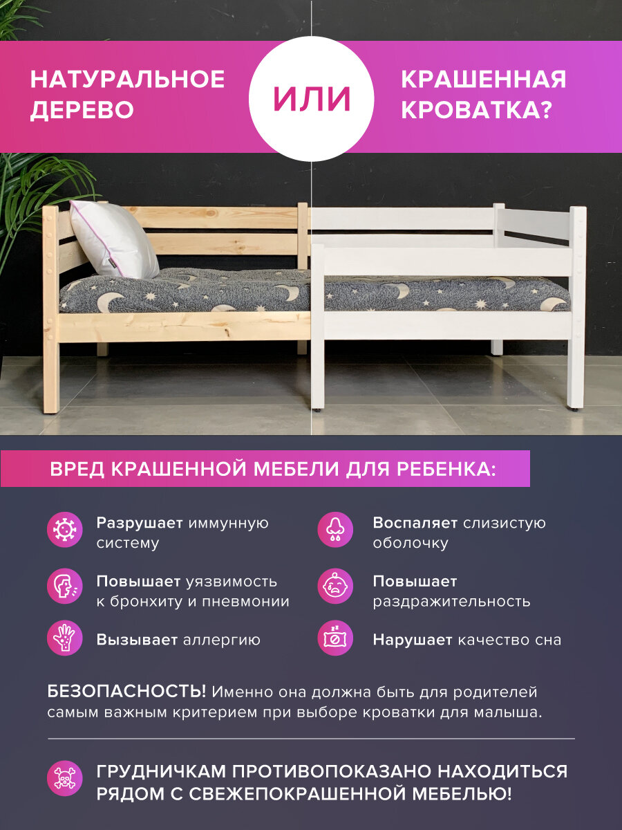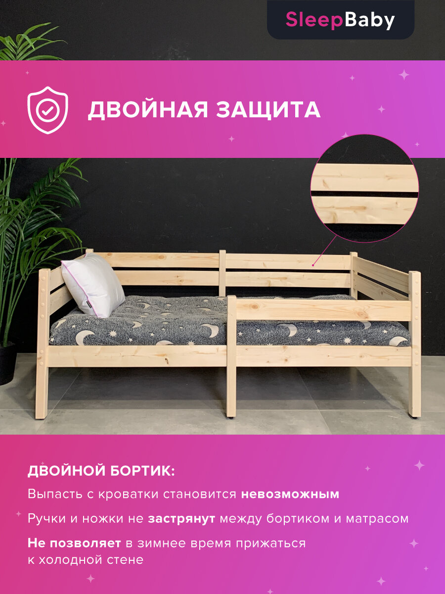 Бортик высотой 35 см с увеличенным крепежом (8 точек вместо стандартных 6) предотвращает падение при активном сне. Расстояние между вертикальными планками 7 см соответствует ГОСТ 19917-93. Для дополнительной защиты: