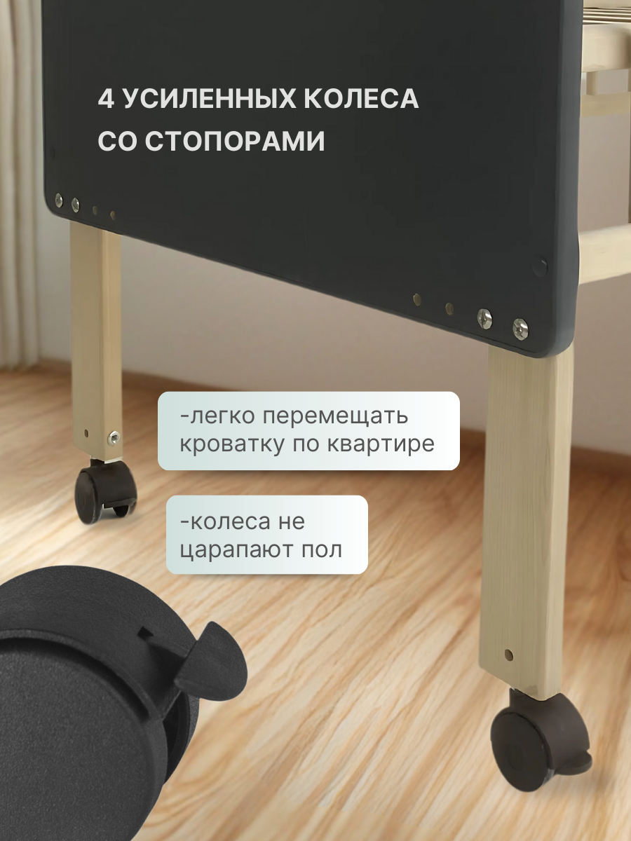 Поперечное маятниковое качание PEPPI обеспечивает плавное укачивание без перенаправления кроватки – принципиальное отличие от продольных аналогов. Механизм работает при лёгком касании рукой, снижая нагрузку на спину родителей. Для сравнения: модели Pali Group требуют полного наклона корпуса.