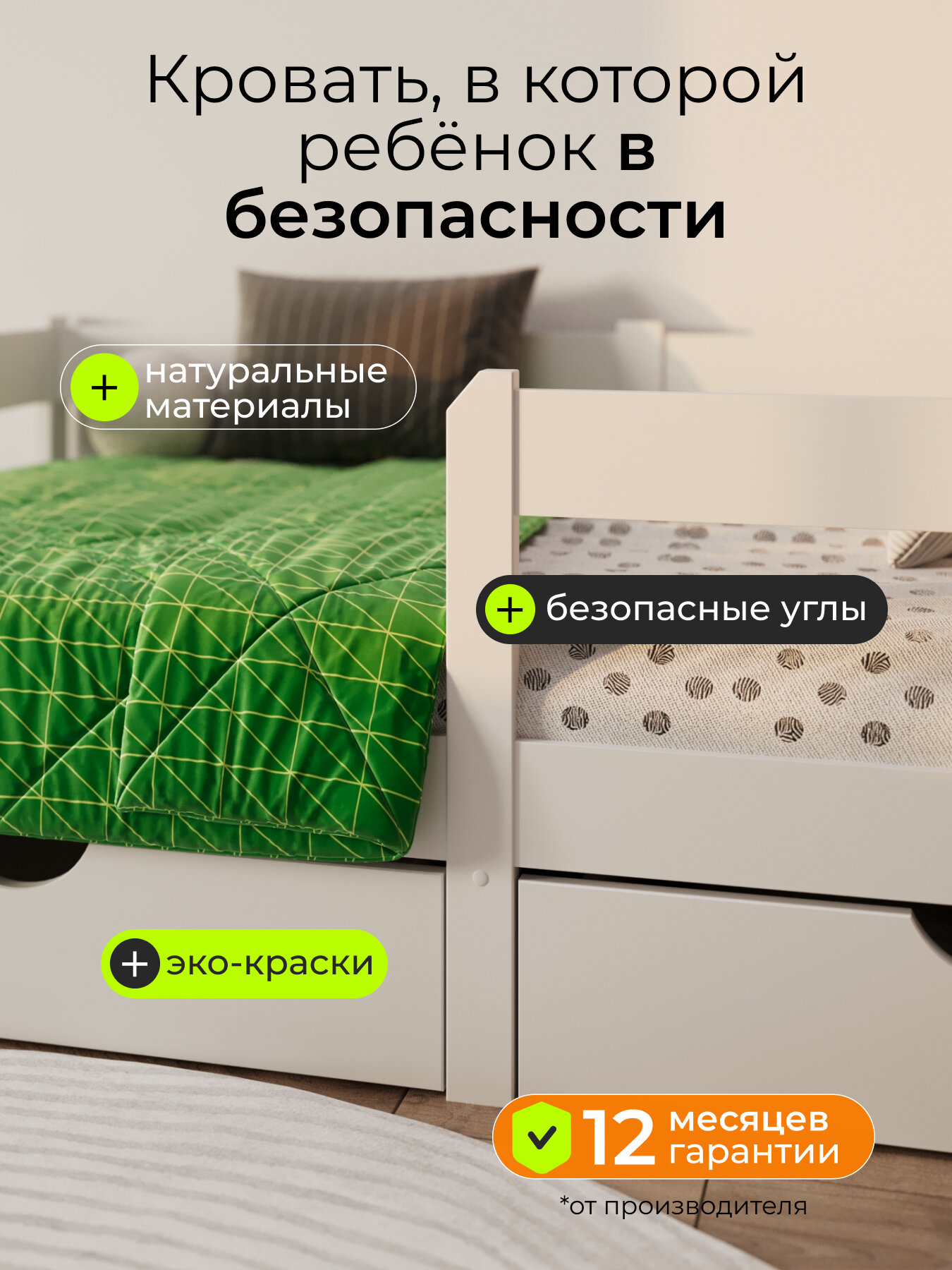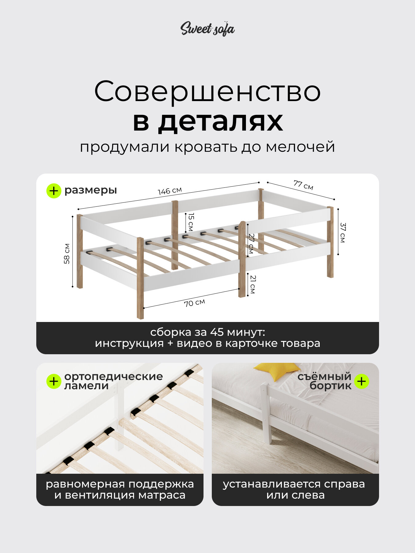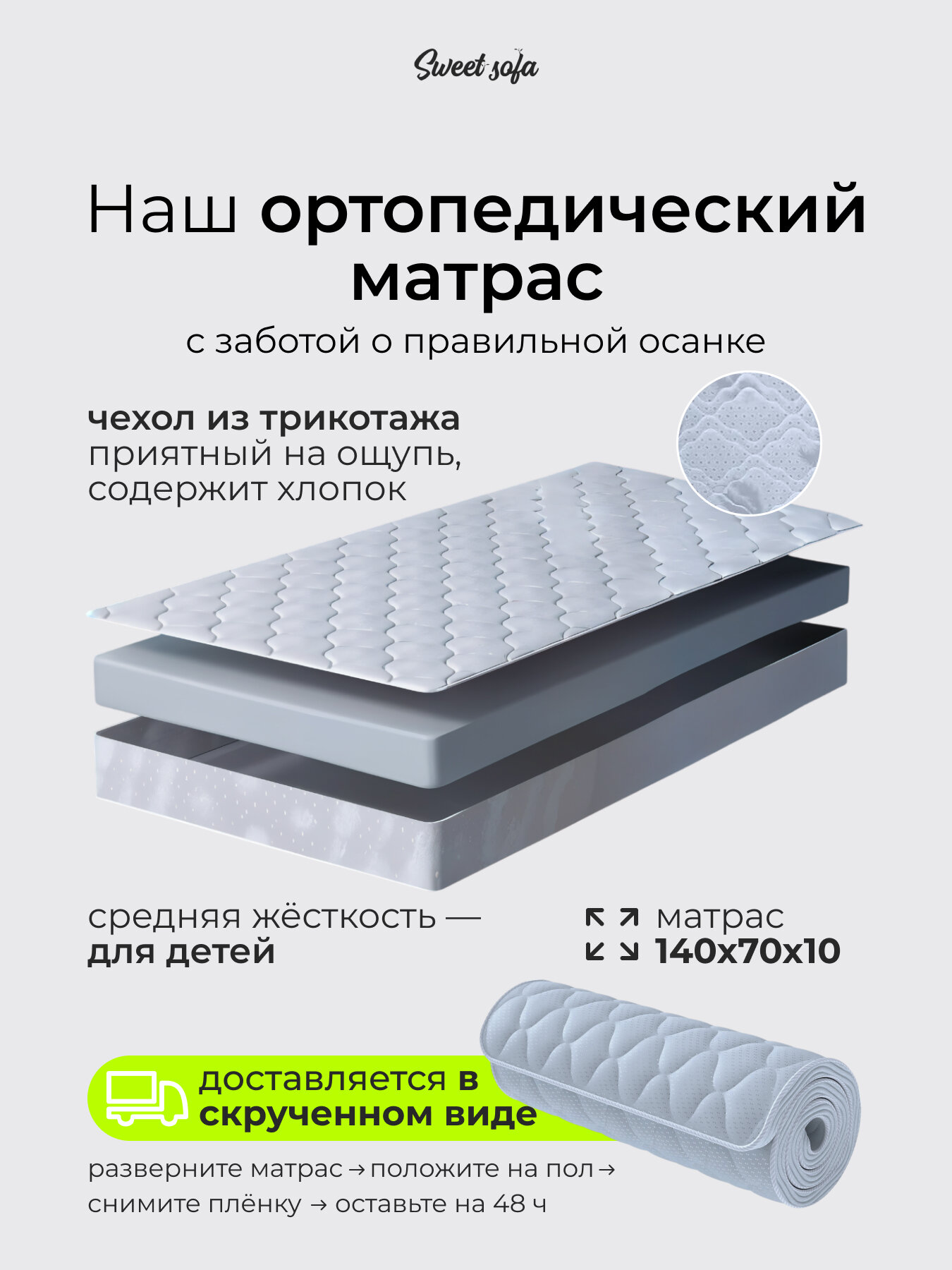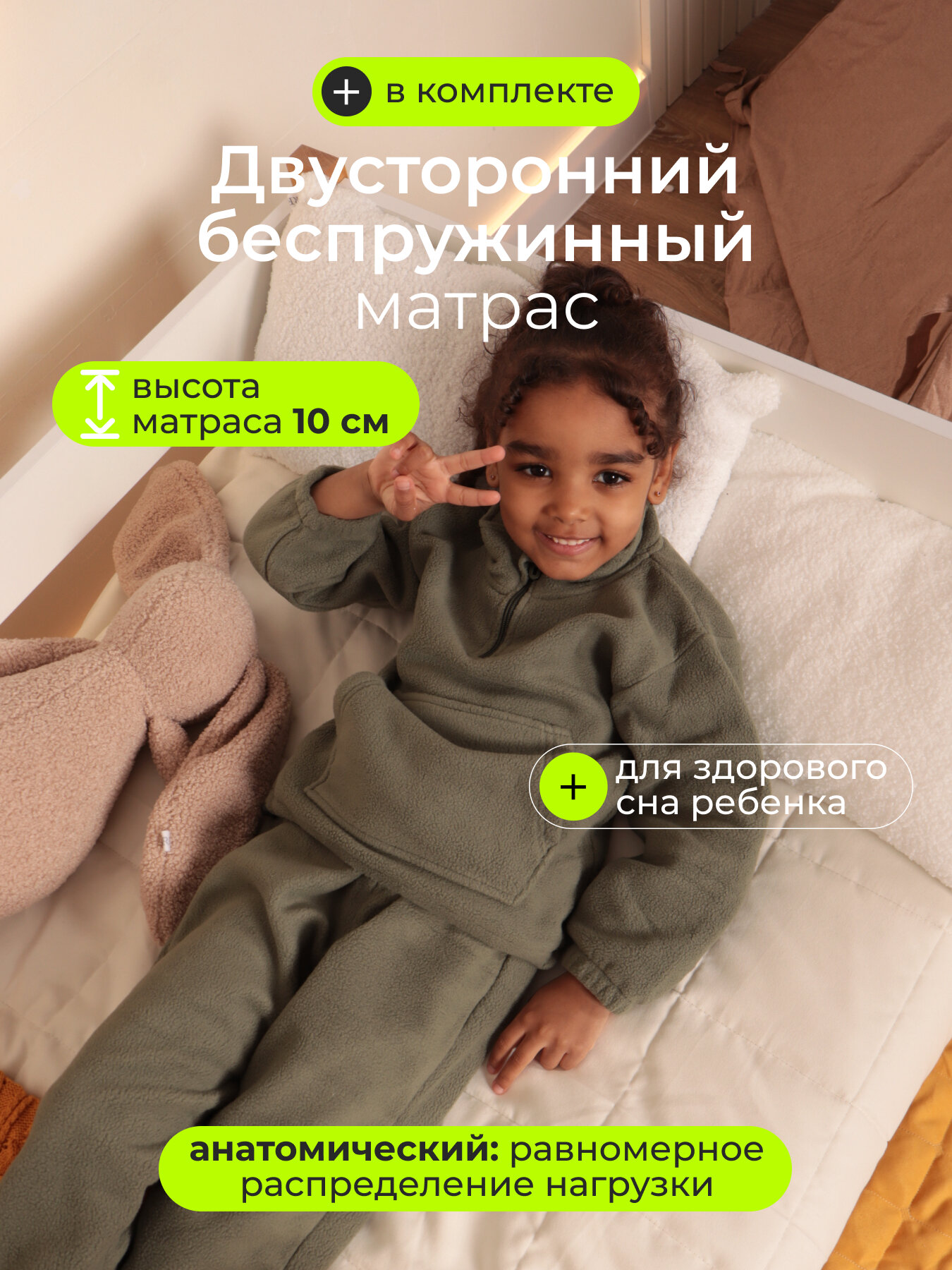 Габариты 140х70 см специально рассчитаны для детей от 3 до 8 лет - оптимальный баланс между комфортом и экономией пространства. Трехслойный матрас толщиной 12 см с хлопковым чехлом поддерживает правильное положение позвоночника во время сна.