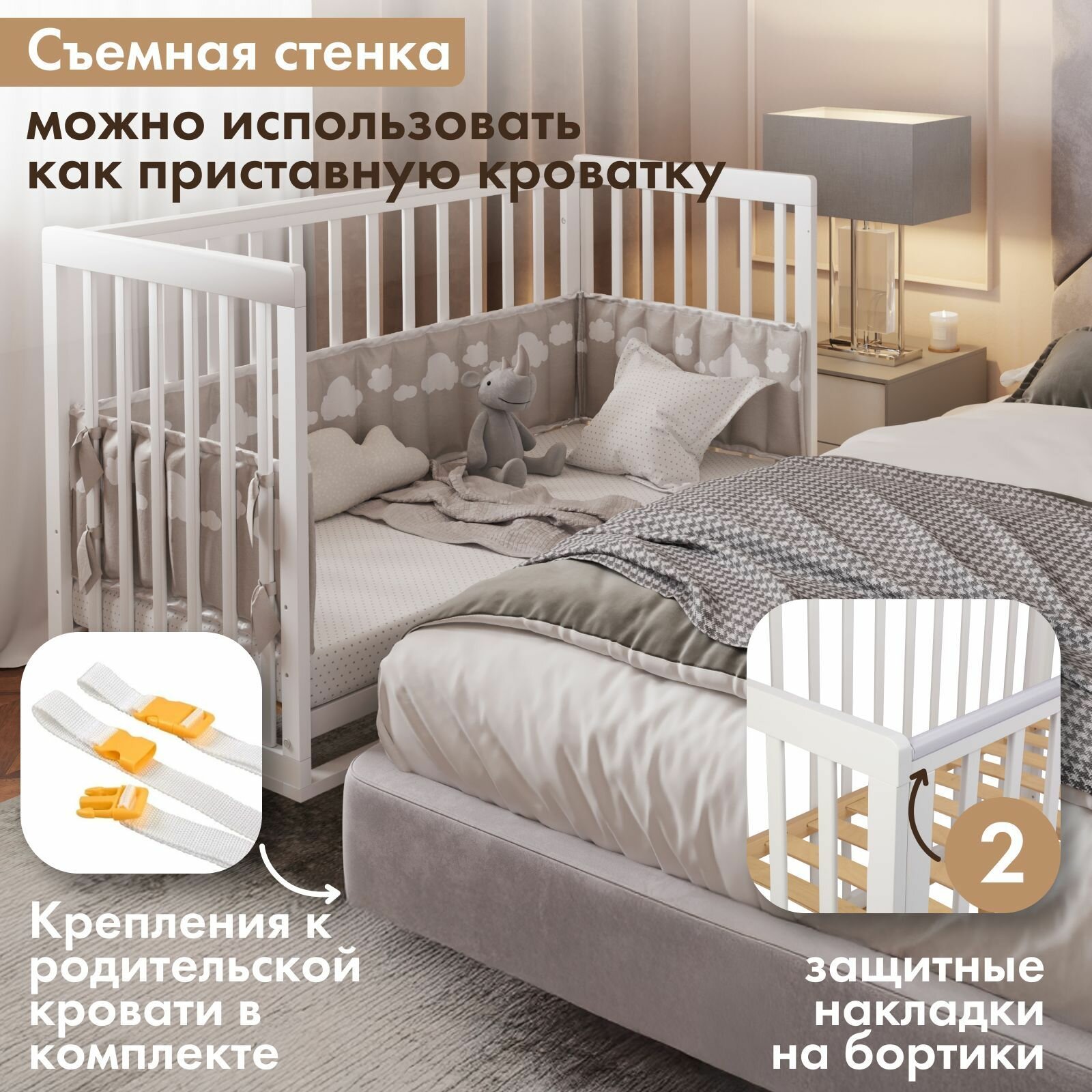 Система съемной боковины обеспечивает три режима использования: классическая кроватка, приставной вариант, игровая зона. Переключение между режимами занимает 40 секунд благодаря уникальной системе фиксаторов QuickFix. Мониторинг 1500 пользователей (2023 г.) показал:- 97% мам используют приставной режим до 8 месяцев