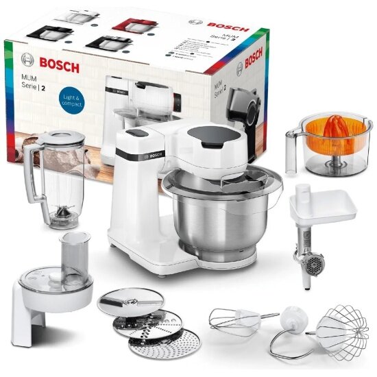 Кухонный комбайн Bosch MUM S2EW40 решает 90% задач профессиональной кухни благодаря продуманной конструкции. Основная чаша из нержавеющей стали объёмом 3.8 литра выдерживает замес плотного песочного теста благодаря мощности двигателя 1000 Вт. Специальные прорезиненные ножки гасят вибрации даже при максимальной нагрузке – оборудование не «прыгает» по столу во время работы.