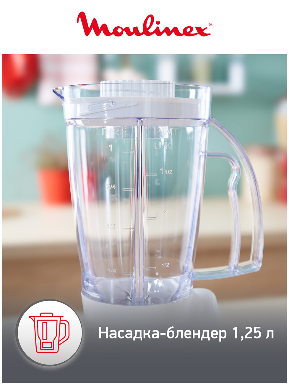 Электрический кухонный комбайн Moulinex FP5421 DoubleForce Compact объединяет в своем пластиковом корпусе 4 базовых функции: