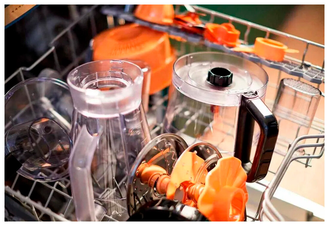 Чаша объёмом 1.5 литра изготовлена из поликарбоната без бисфенола-А, что подтверждено сертификатом EuP Lot 6. Прорезиненные ножки глубиной 18 мм предотвращают скольжение даже на стеклянных поверхностях. Вес устройства - 3.2 кг при габаритах 22×34×28 см позволяет хранить комбайн в навесных шкафах.
