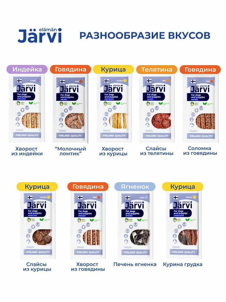 Лакомство Jarvi для собак и щенков всех пород создано с учетом пищевых потребностей питомцев с чувствительным пищеварением. Беззерновой состав исключает пшеницу, кукурузу и сою - основные источники аллергических реакций. Каждый слайс содержит 95% телятины премиального сорта, что подтверждено ветеринарными сертификатами качества.