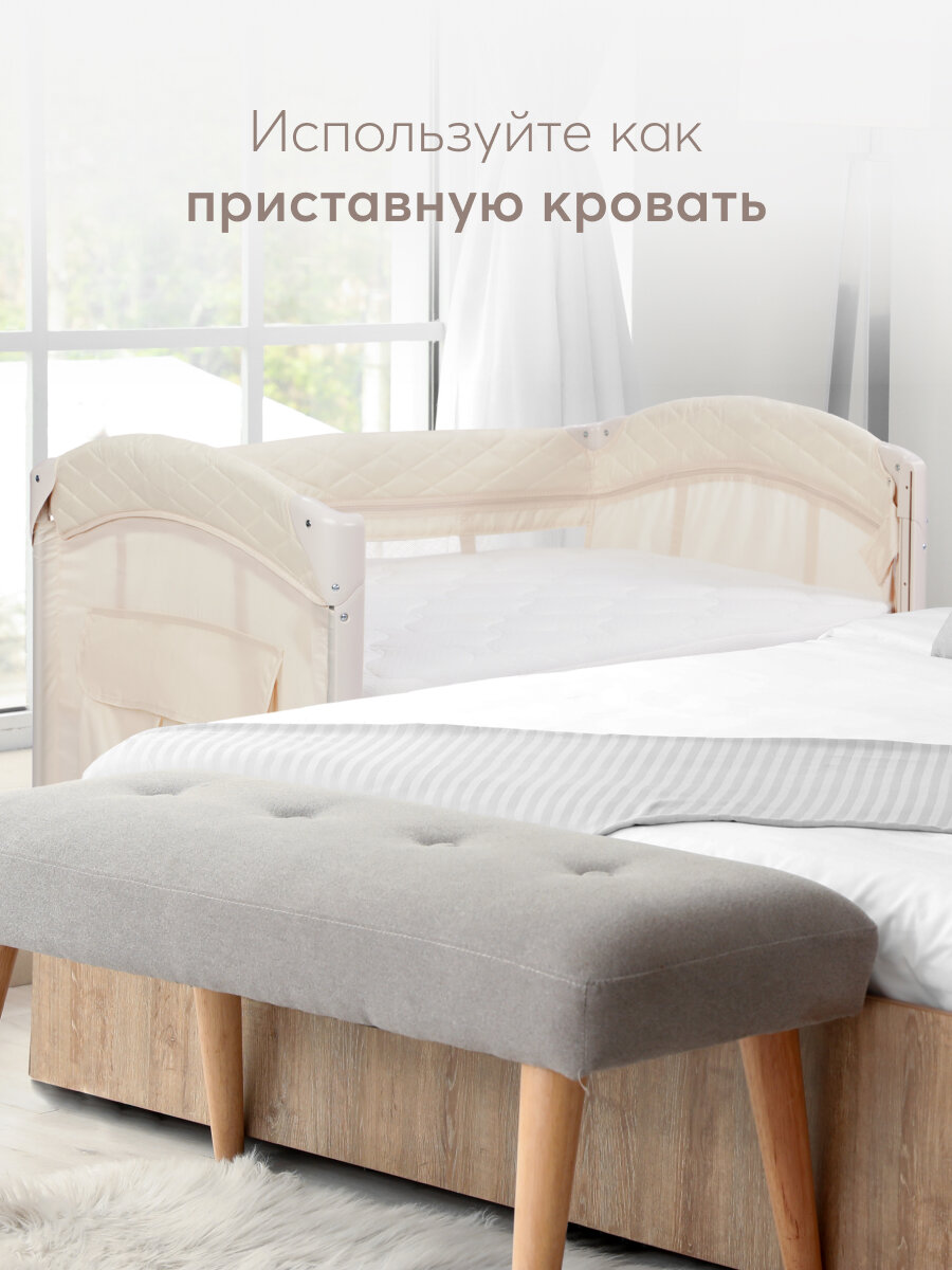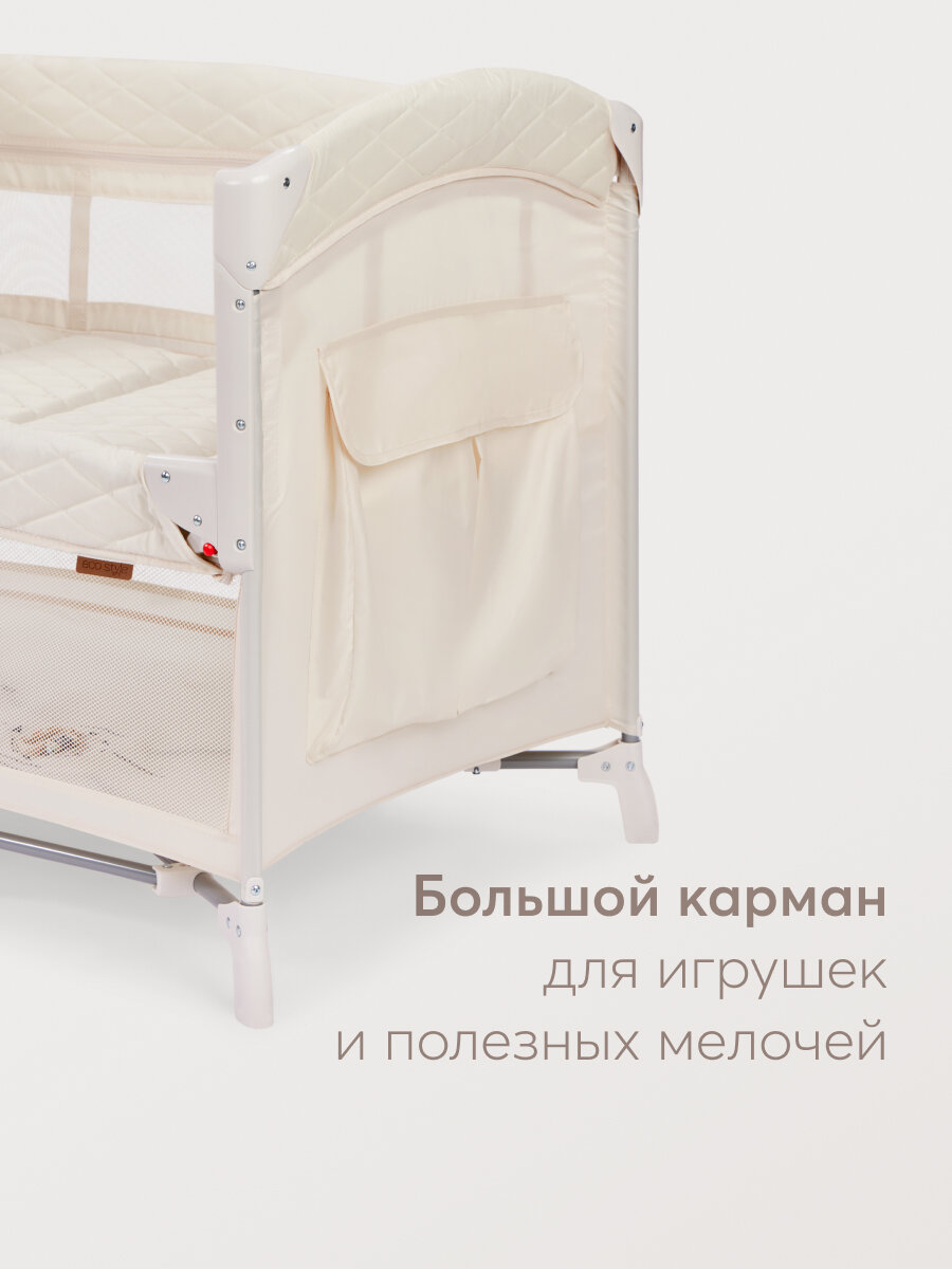 Для малогабаритных квартир манеж исполняет 3 функции: спальное место (с бортиками высотой 82.5 см), игровая зона (площадь 0.75 м²) и система хранения (4 кармана по периметру). В сложенном состоянии занимает место между шкафом и стеной.