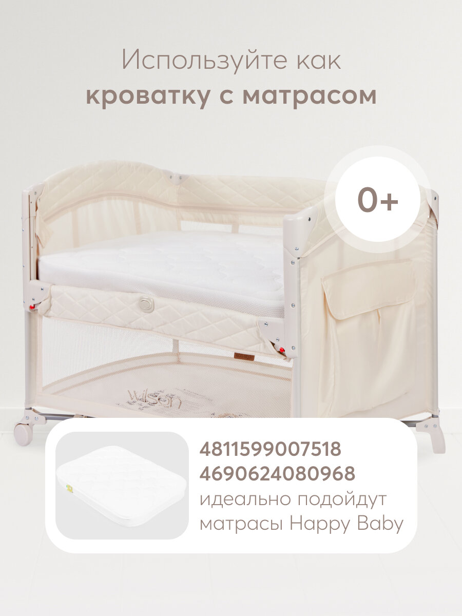 К манежу WILSON подходят 15 аксессуаров бренда: от москитной сетки до музыкального мобиля. Владельцы получают скидку 10% на всю линейку Happy Baby при регистрации товара на официальном сайте. Для кремовой модели доступны 3 варианта балдахинов в тон.