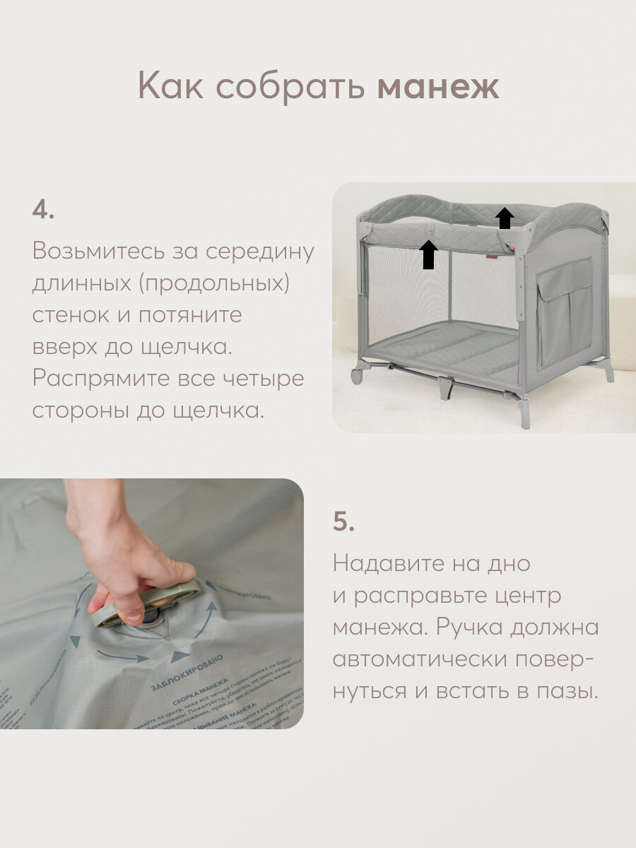 4 поворотных колеса с блокираторами – вы перемещаете манеж по квартире одной рукой, а при активации тормоза конструкция фиксируется на месте. Зонтичная система складывания уменьшает габариты до 27 см в толщину – для хранения или перевозки в багажнике. Включает водонепроницаемую сумку-чехол с плечевым ремнём – идеально для поездок на дачу.