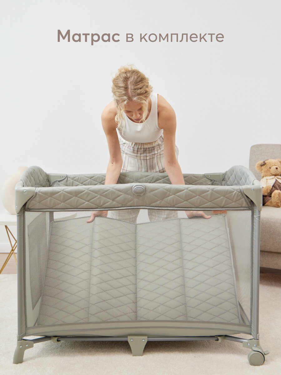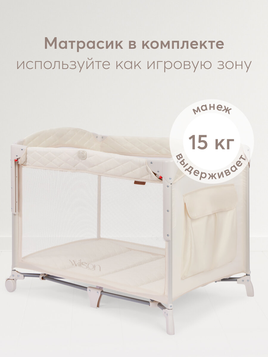 Металлический каркас с двойным усилением обеспечивает устойчивость конструкции – в отличие от бюджетных моделей, WILSON не шатается даже при активных играх. Регулировка высоты дна в трёх положениях (50/60/65 см) позволяет адаптировать манеж по мере роста ребёнка. В комплекте идёт сертифицированный ортопедический матрас толщиной 3 см с гипоаллергенным наполнителем.
