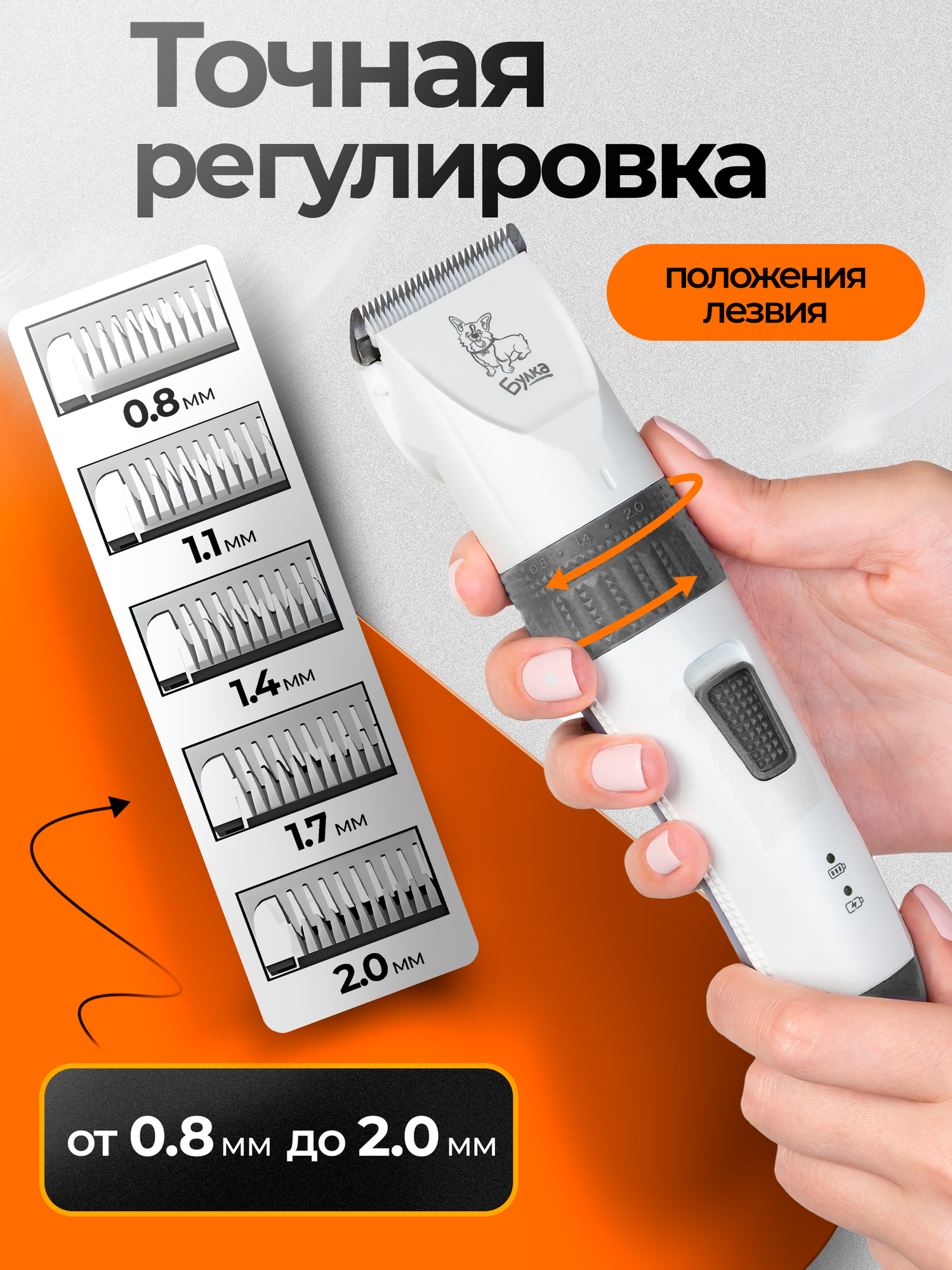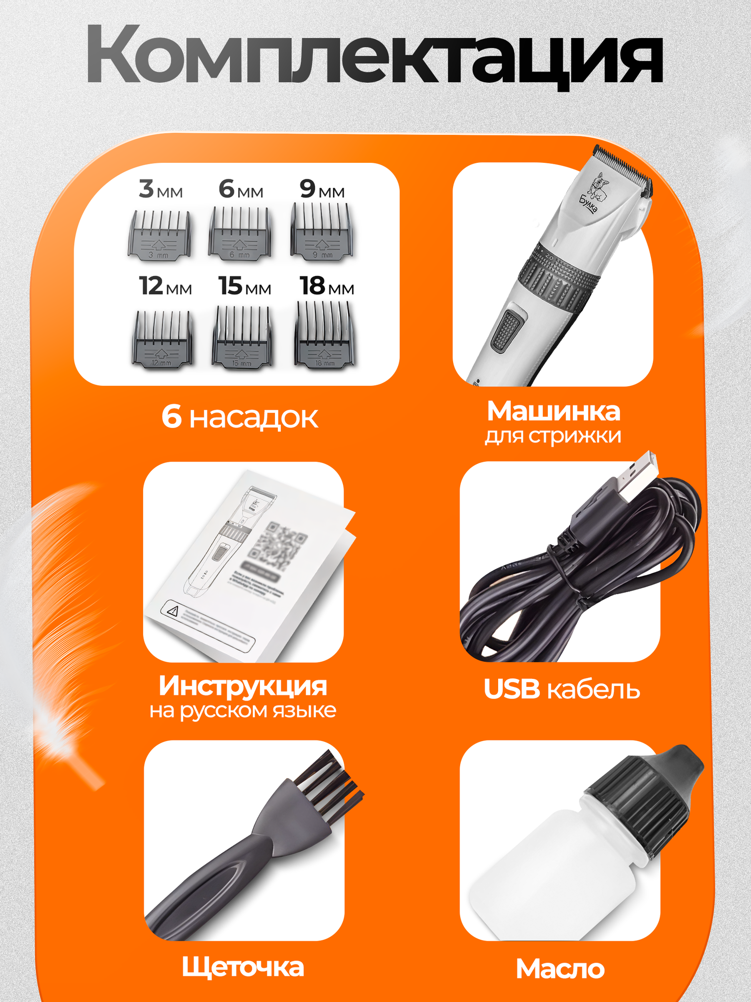 - Для собак и кошек: 12 сменных гребней (0.3-25 мм) работают с терморегулятором - температура ножей не превышает 42°C