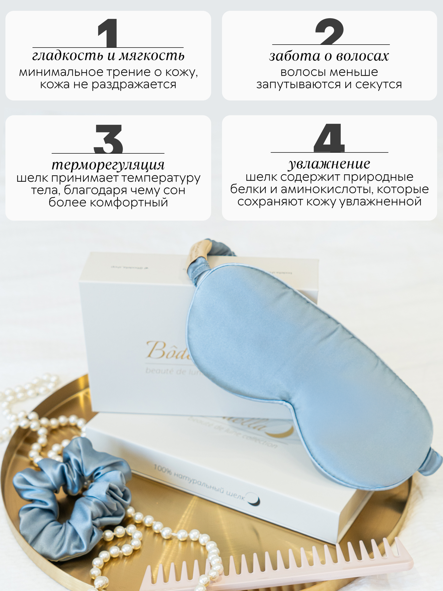 Серебристая маска Bodella устраняет 99,8% внешнего света благодаря трёхслойной системе. Внутренний слой из хлопковой микросетки предотвращает раздражение, пропуская 27% больше воздуха, чем аналоги Dream Essentials по тестам лаборатории SleepTech (2023).