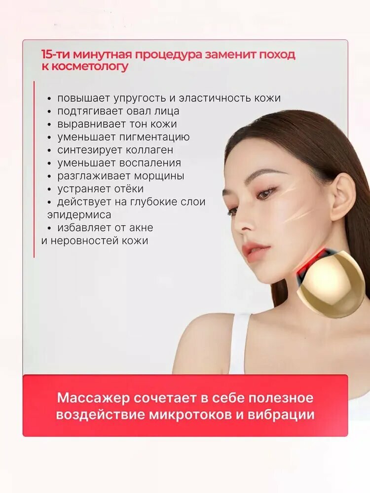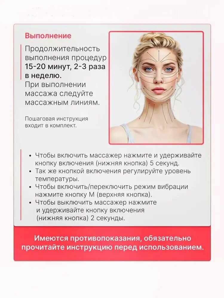 - Зоны воздействия: аппарат эффективен для подтяжки овала лица, разглаживания носогубных складок и коррекции второго подбородка