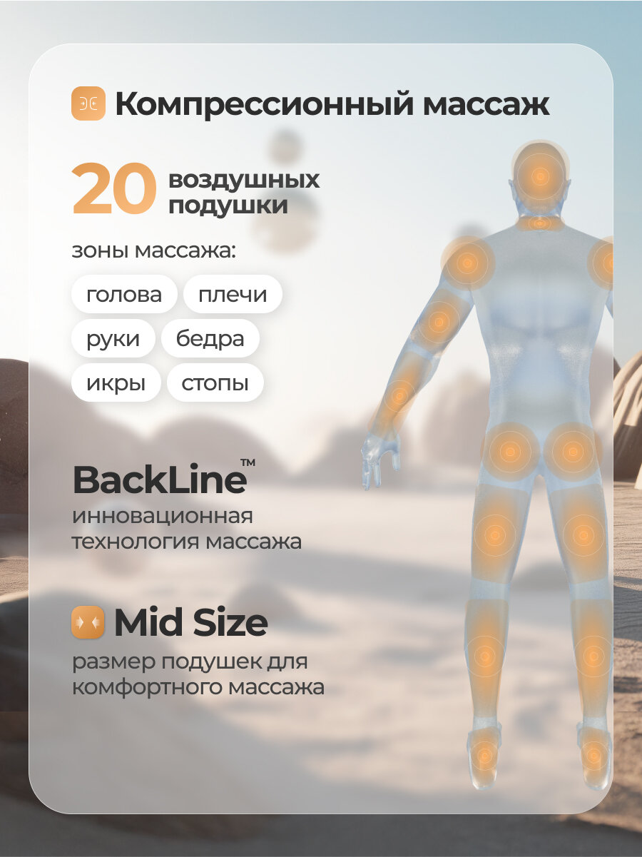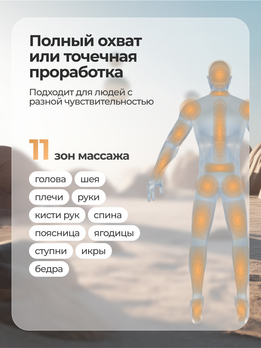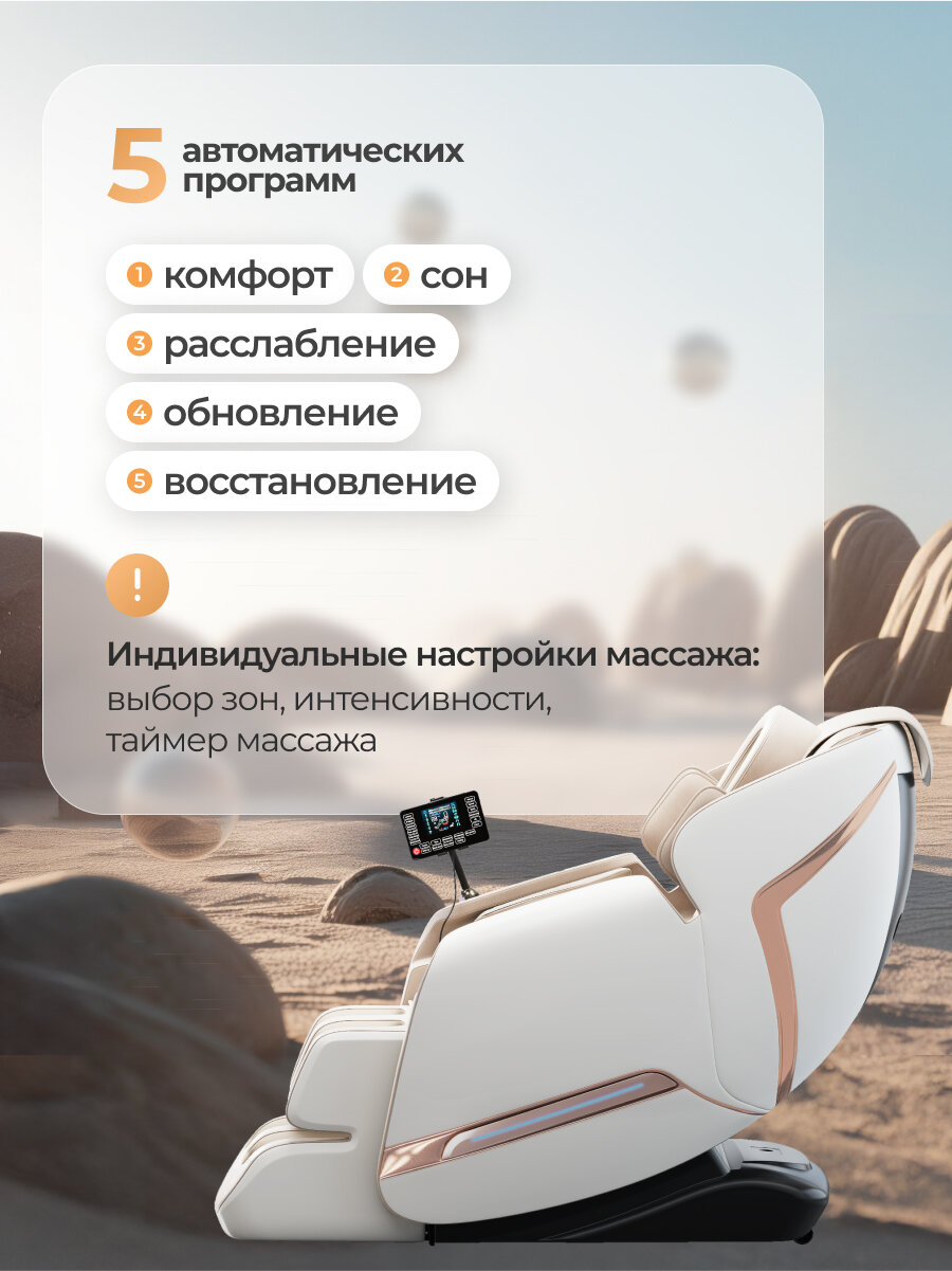 Конструкция с регулируемым наклоном спинки до 165° обеспечивает 3 режима эксплуатации: массаж сидя, положение Zero-G для снятия нагрузки с позвоночника и лежачее положение для полного расслабления. Механизм адаптации включает: