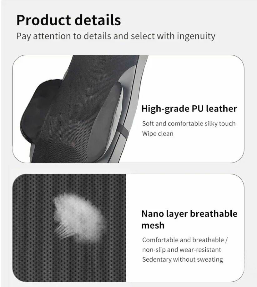 Интеллектуальная форма спинки повторяет S-образный изгиб позвоночника с погрешностью 0.5 см. В конструкции использованы: