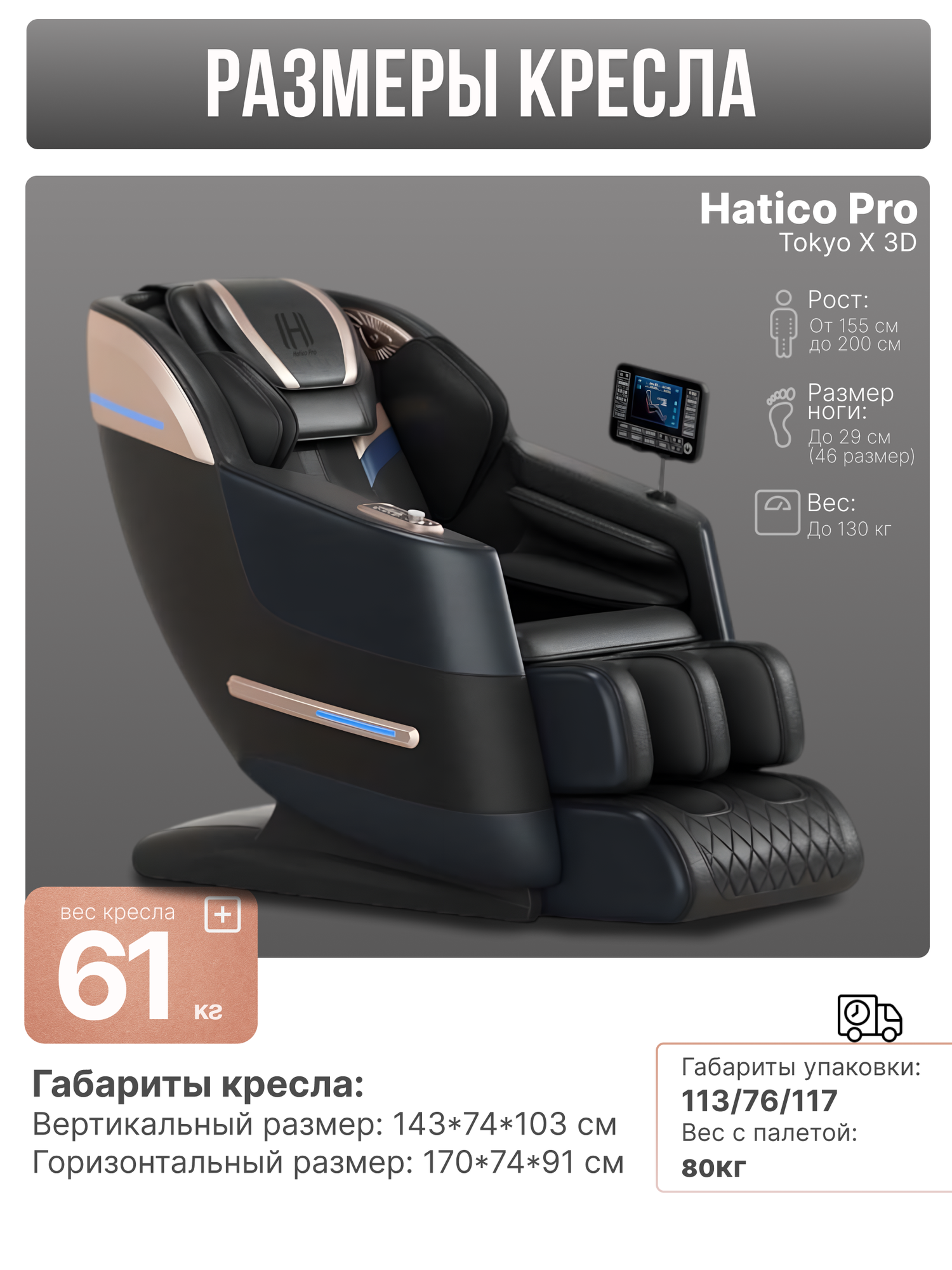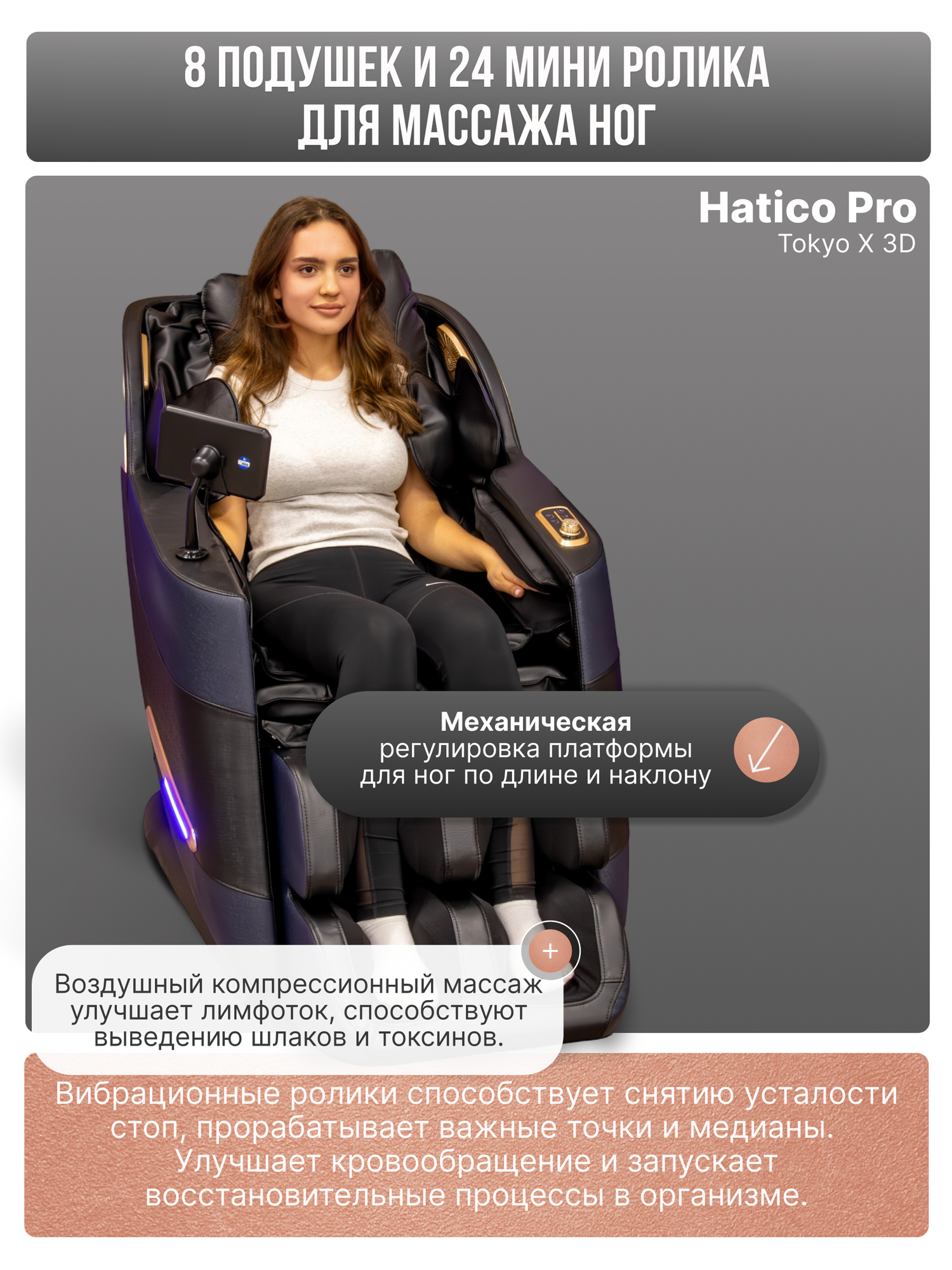 Стальной каркас и HD-моторы обеспечивают 4 уровня интенсивности воздействия. Скручивание поясницы деликатно растягивает позвоночник, снимая нагрузку с межпозвонковых дисков. Динамический воздушный компрессор прорабатывает икроножные мышцы и ступни через систему подушек: