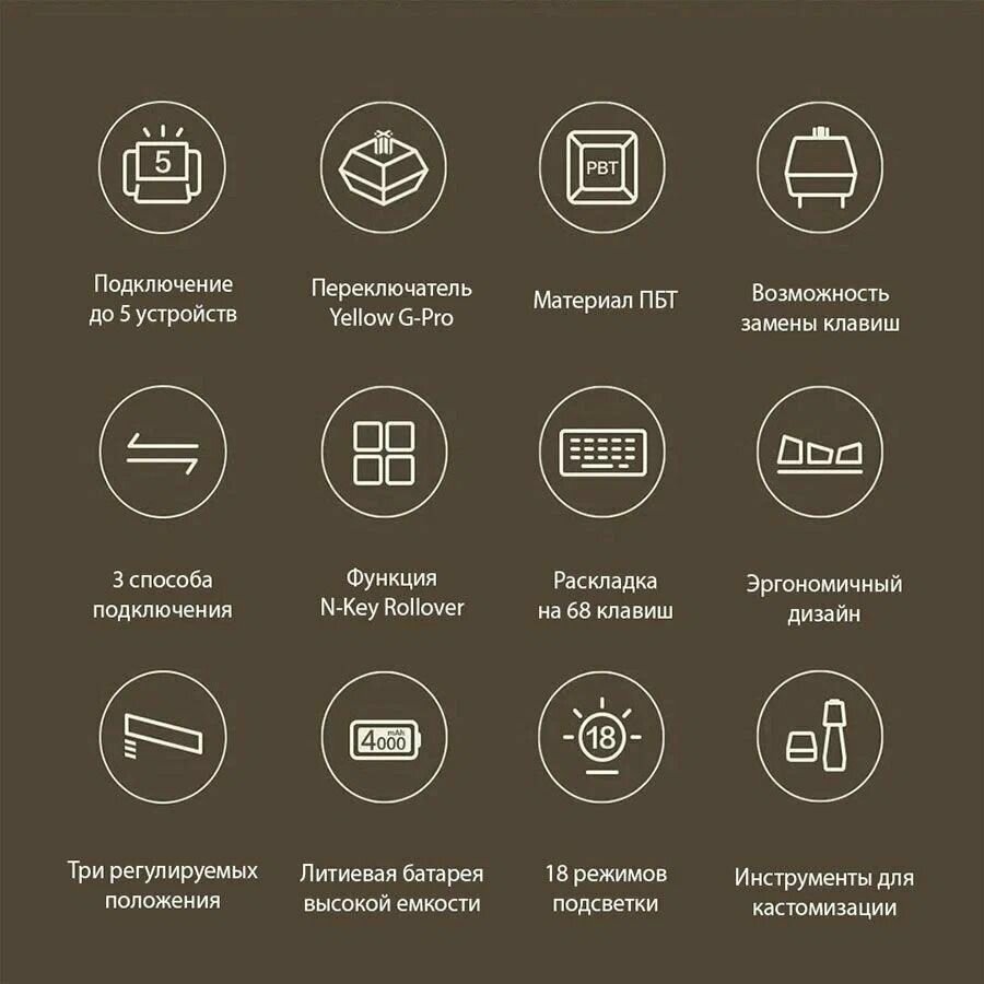 Дублированные F-клавиши через Fn-слой позволяют сохранить все функции полноразмерной клавиатуры при уменьшенных габаритах — 15 программируемых макросов сохраняются во внутренней памяти. Для языков СНГ предусмотрены кириллические кейкапы с двойным шрифтом — решение для мультиязычных пользователей.