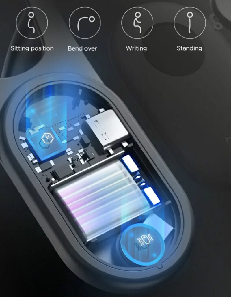 Электронный корректор MIJIA Hipee использует MEMS-датчики для отслеживания положения позвоночника в реальном времени. При отклонении от заданного угла происходит вибрационное оповещение трёх типов интенсивности. Основные компоненты: