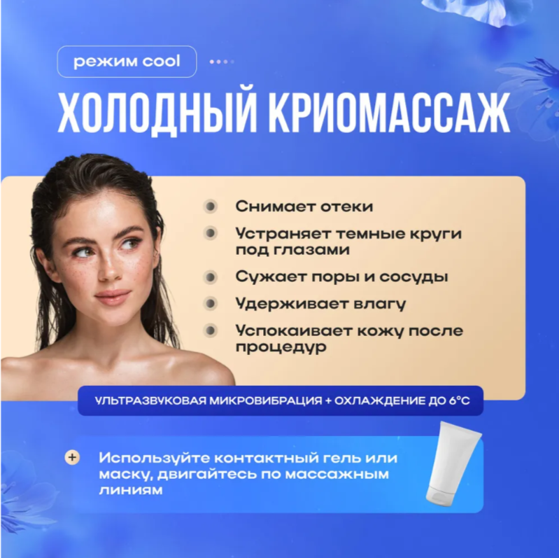 - Криомассажная головка поддерживает стабильную температуру -5°C для мгновенного снятия отеков