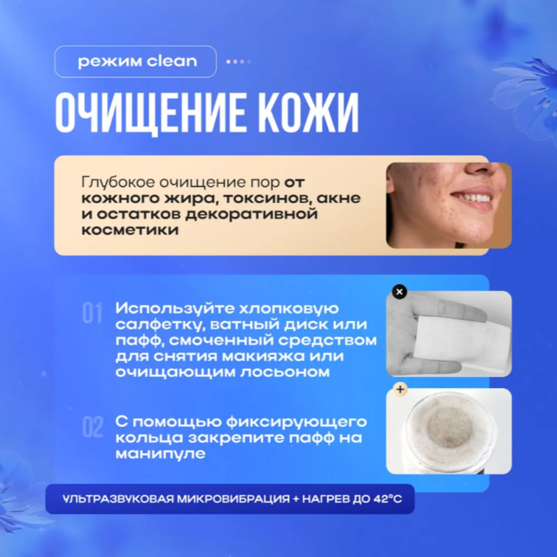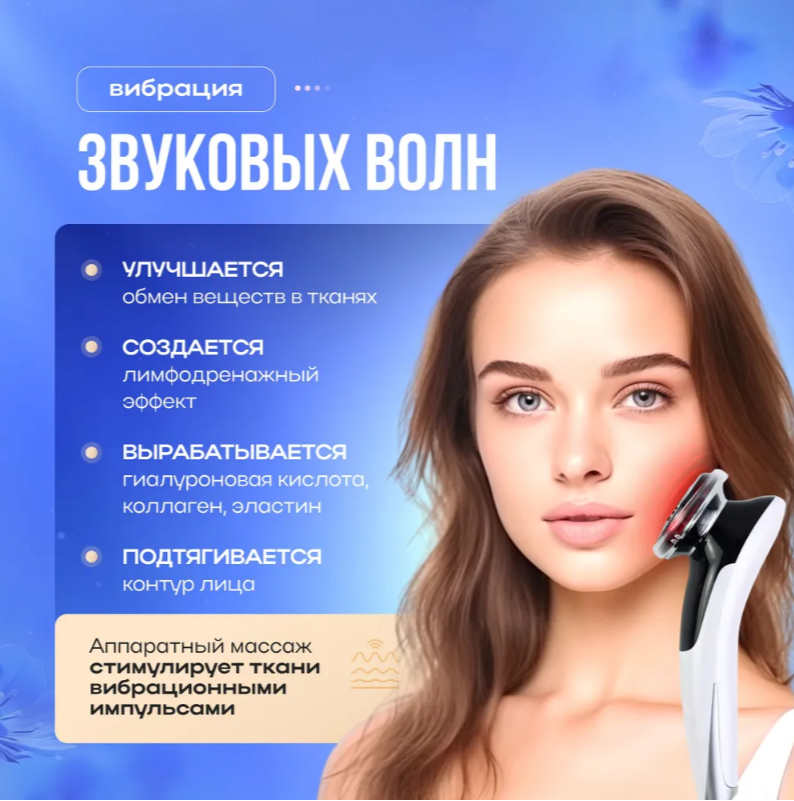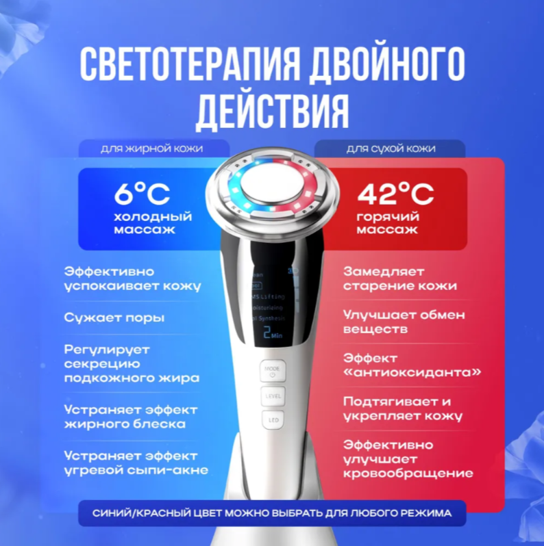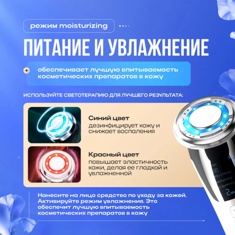 - RGB хромотерапия с автоматической настройкой под тип кожи: голубой для жирной, красный для увядающей, зеленый для чувствительной