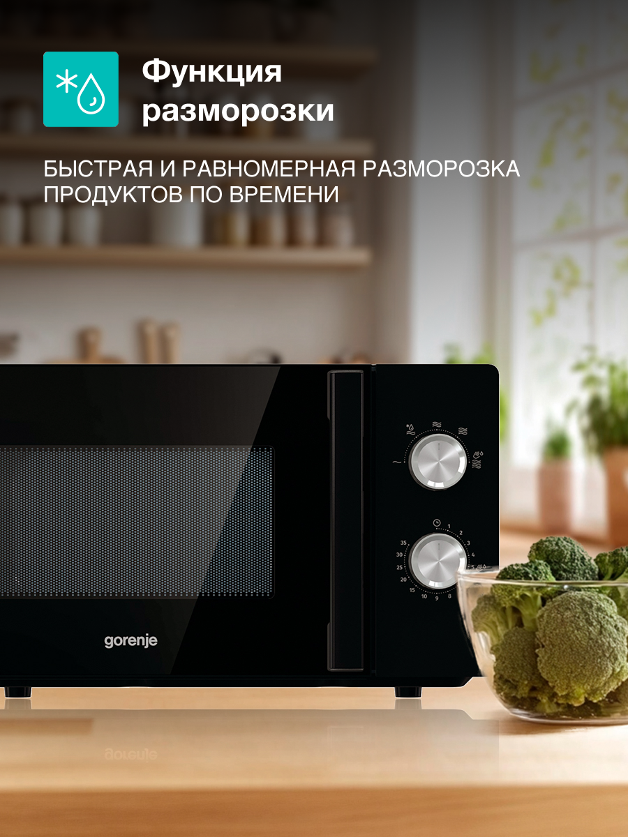 Микроволновая печь Gorenje MO20E2BH 740249 сочетает компактные габариты 45.1×35.3×26.1 см с функциональностью. Объём камеры 20 литров оптимален для разогрева стандартных порций и посуды диаметром до 25 см. Мощность 800 Вт обеспечивает: