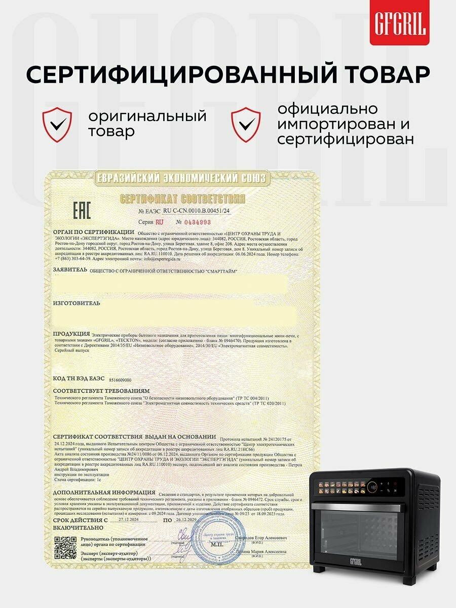Мини печь GFGRIL GFO-09 с объемом камеры 9 литров создает идеальные условия для приготовления блюд благодаря