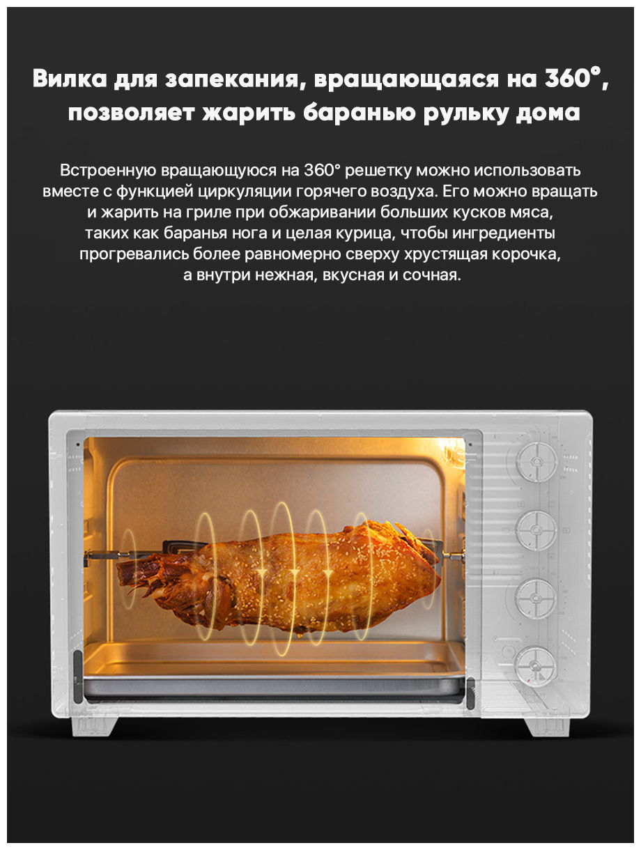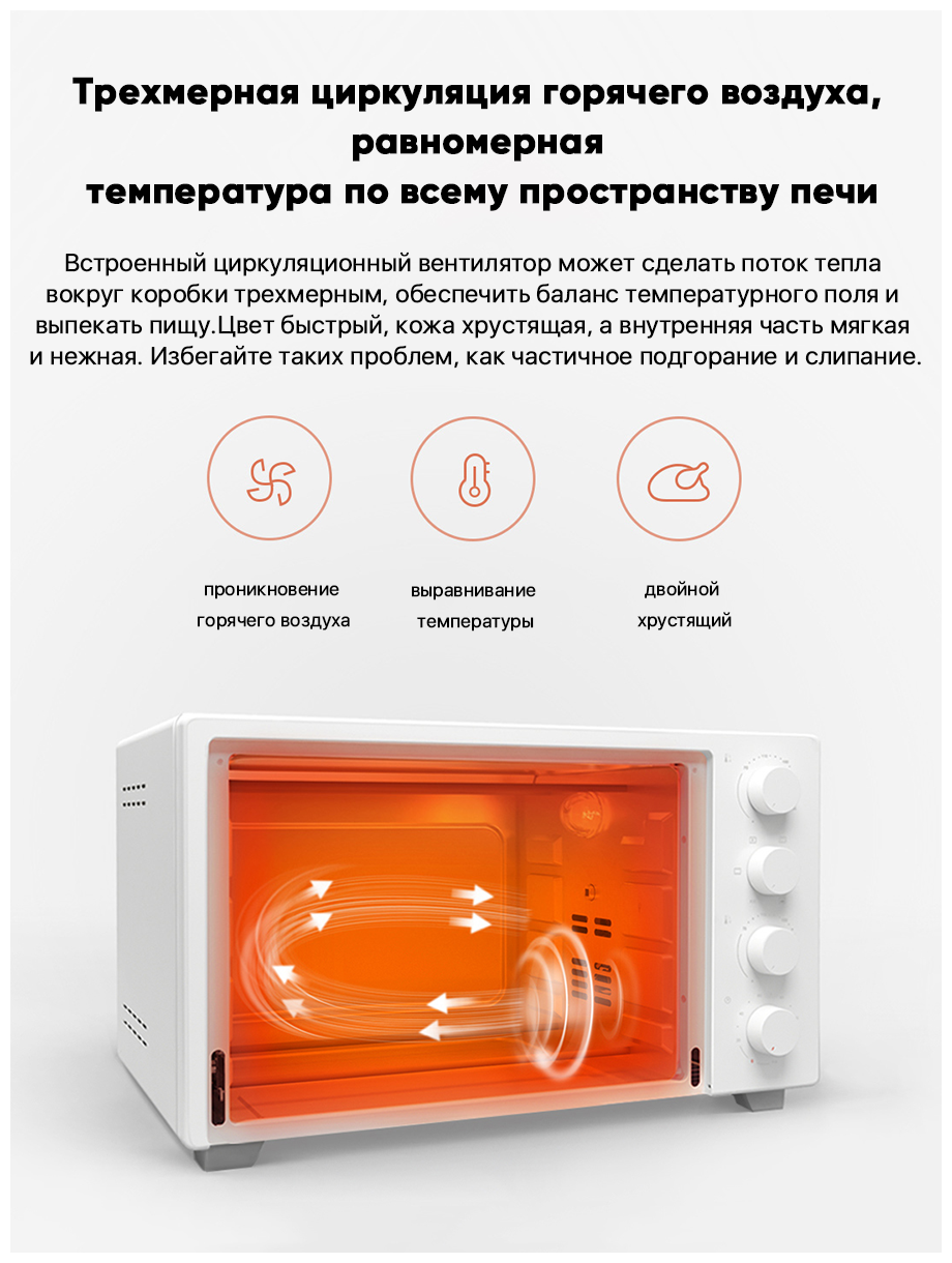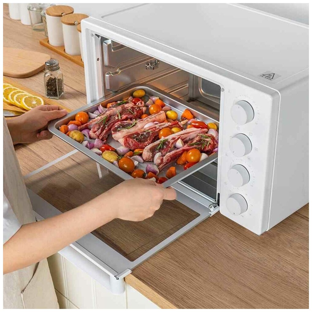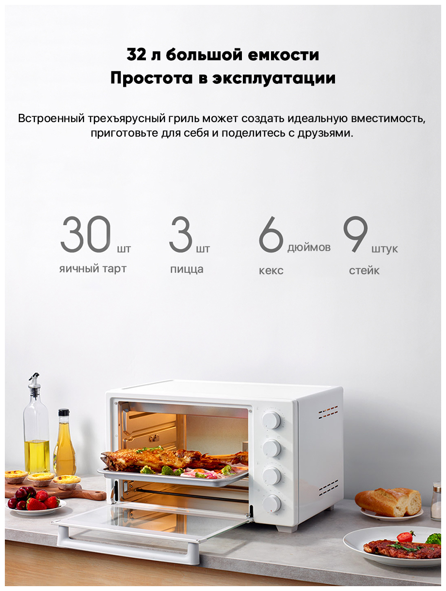 Мини-печь Mijia MDKXDE1ACM решает 5 основных задач в компактной кухне: замена крупногабаритной духовки, быстрое приготовление выпечки, разогрев порционных блюд, поддержание температуры готовых блюд до подачи, диетическое приготовление без масла. При габаритах 50.7×38.2×30.8 см 32-литровая камера позволяет готовить курицу-гриль весом до 1.8 кг или противень печенья размером 35×25 см.