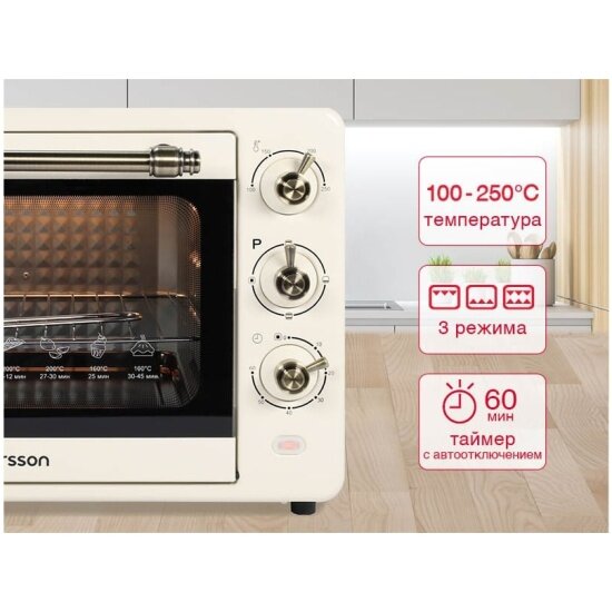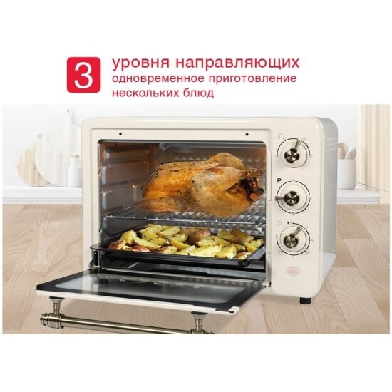 Компактные габариты 44.5×38.5×41.5 см позволяют установить мини-печь на кухонном столе или в нише. Внутренний объем 28 литров рассчитан на противень размером 32×28 см. При мощности 1500 Вт достигается максимальный нагрев камеры до 250°C - оптимально для пиццы, запеченных овощей или кексов. Вес техники 9.8 кг обеспечивает устойчивость при открывании дверцы.