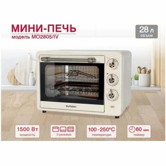 Мини-печь Oursson поставляется в заводской коробке с гарантией 24 месяца. Бесплатная доставка действует при заказе от 15,000 рублей. В комплекте: руководство пользователя, гарантийный талон, сертификат безопасности.
