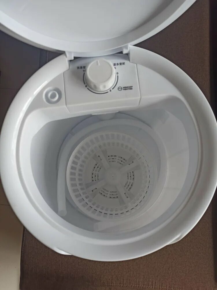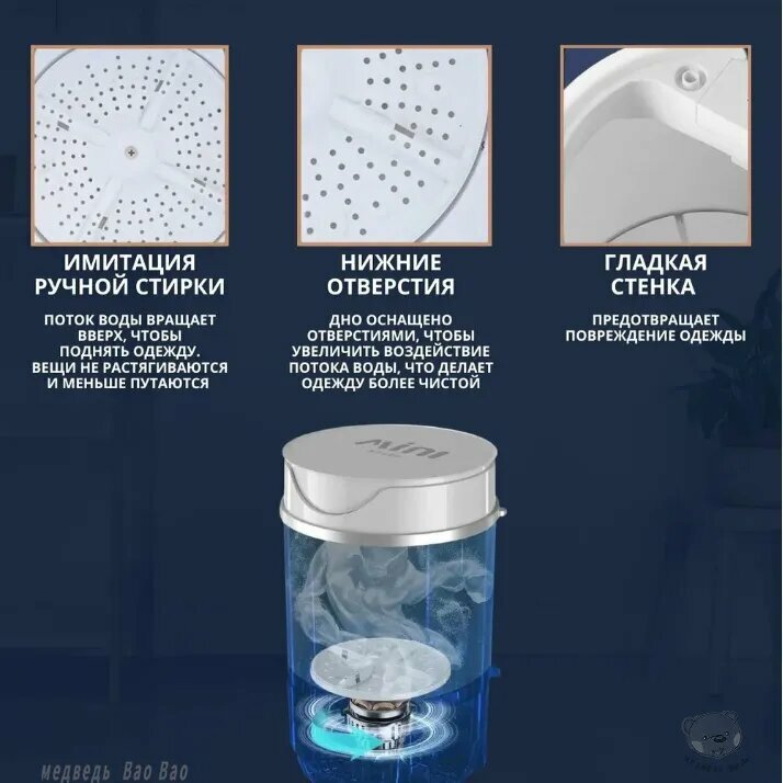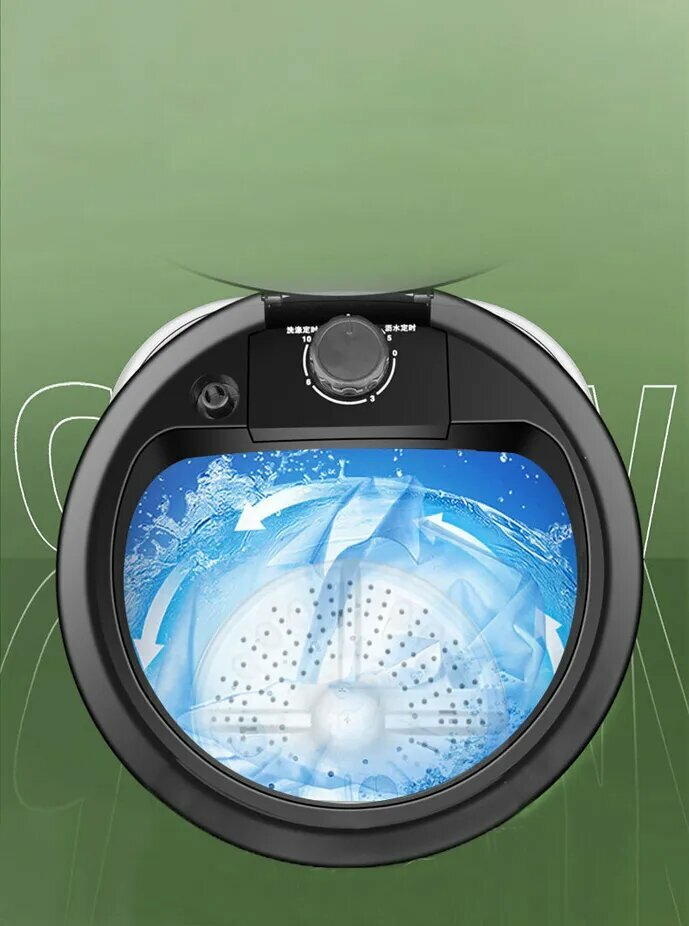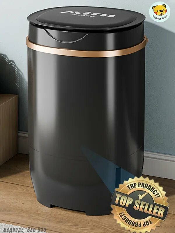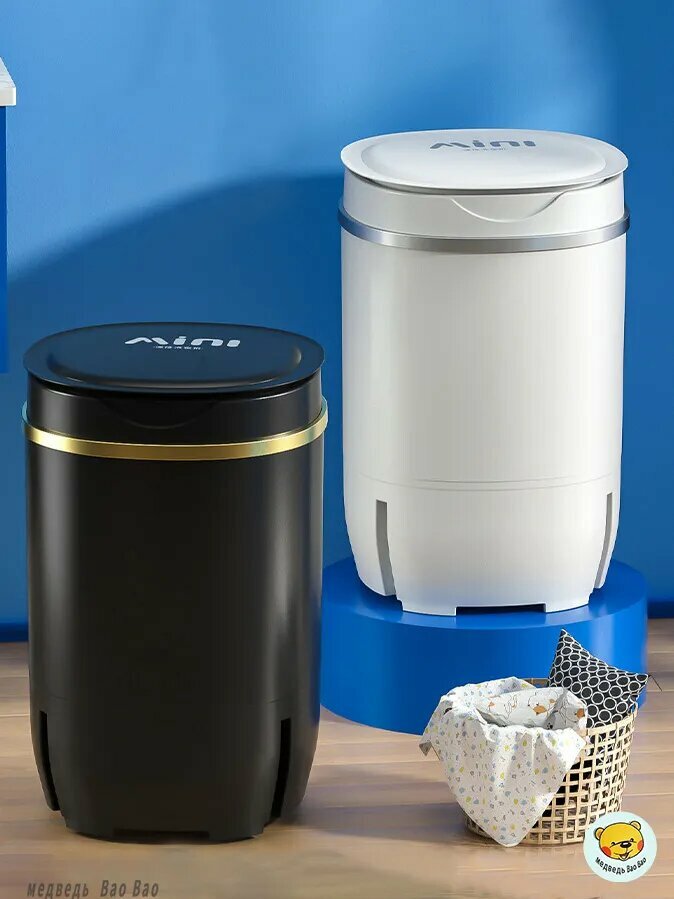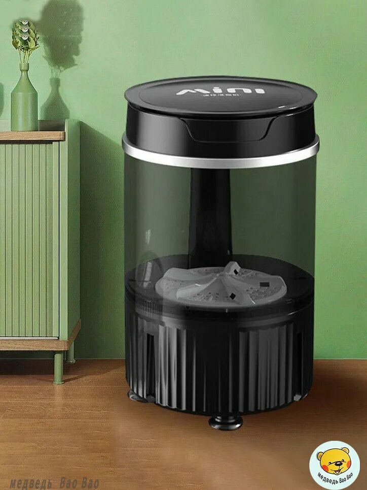 Черная мини стиральная машина мощностью 300 Вт с баком 4,5 литра специально разработана для ограниченных пространств. Её габариты 28x28x35 см позволяют размещать технику: