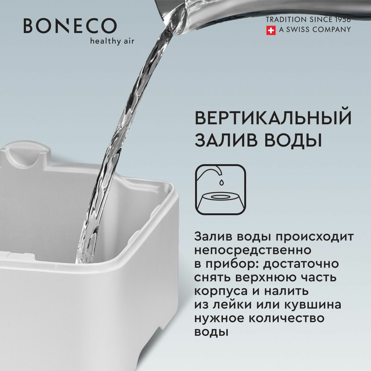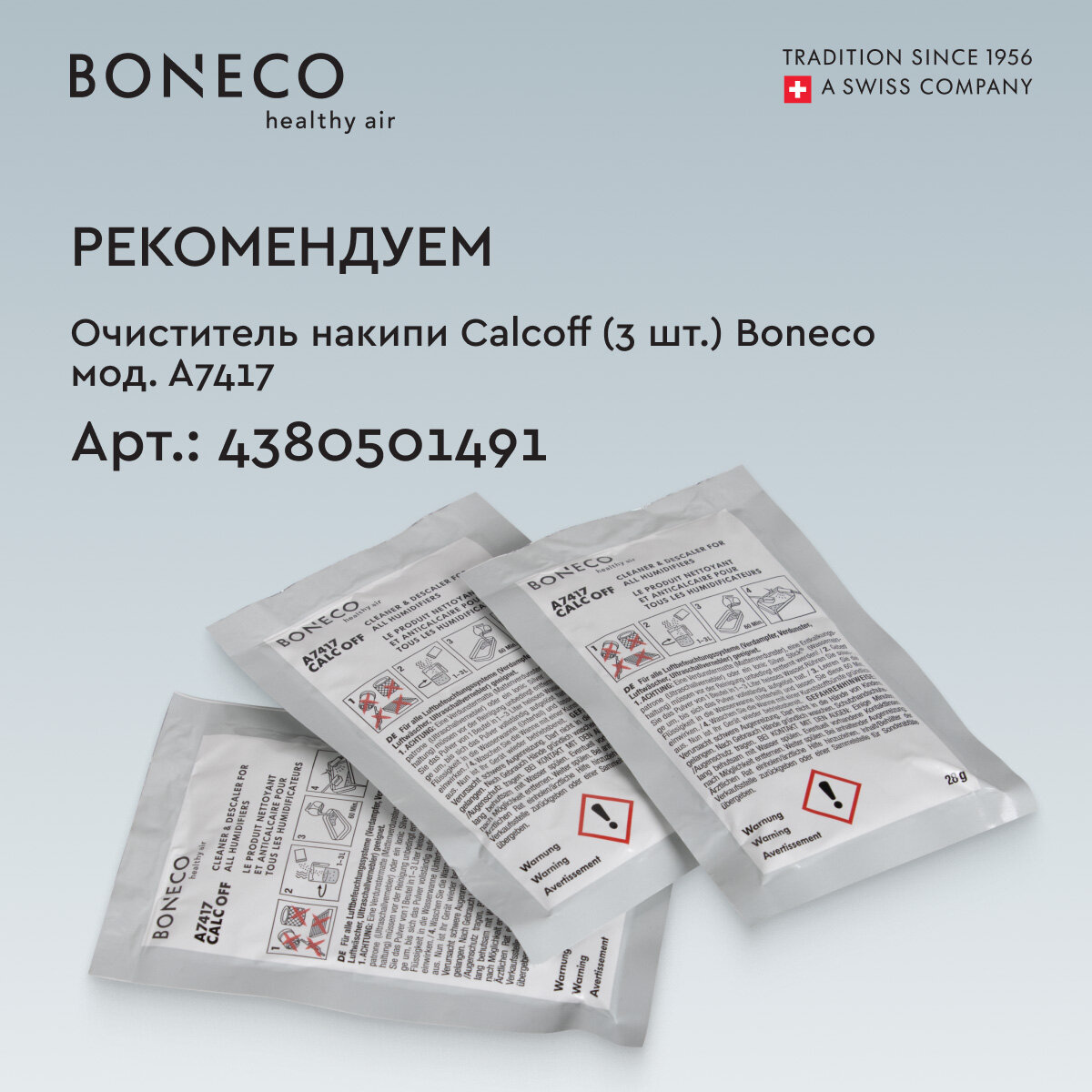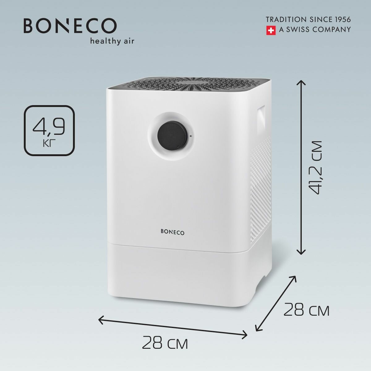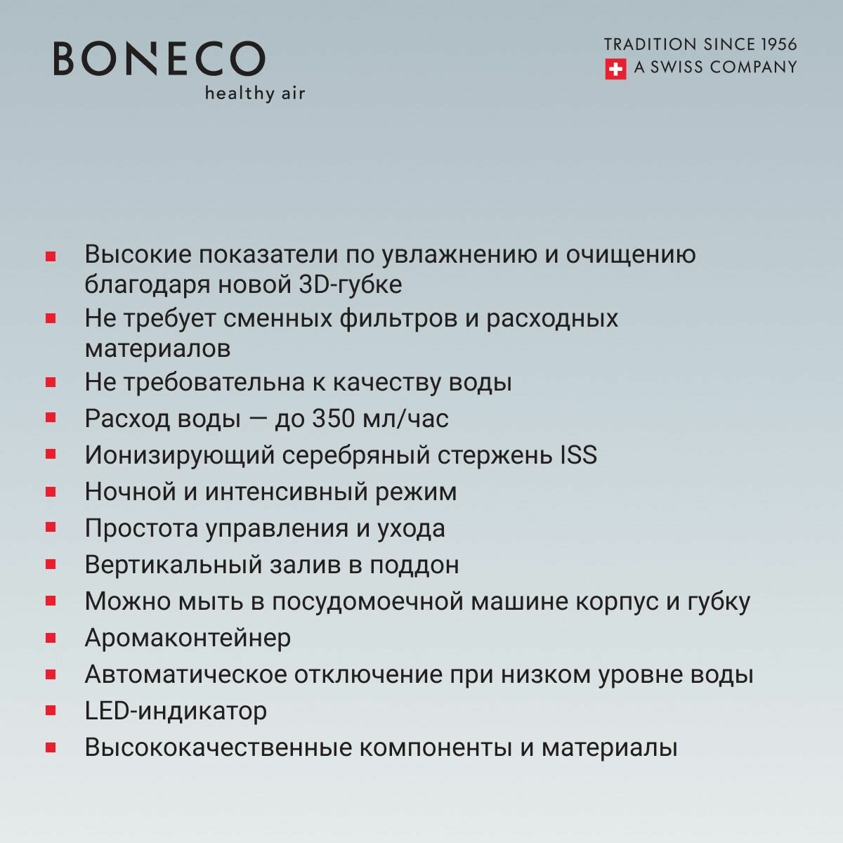 Официальный срок гарантии от производителя – 2 года на электронные компоненты и 6 месяцев на расходные материалы. В случае поломки сервисные центры Boneco в Москве и Санкт-Петербурге проводят бесплатную диагностику в течение 3 рабочих дней.