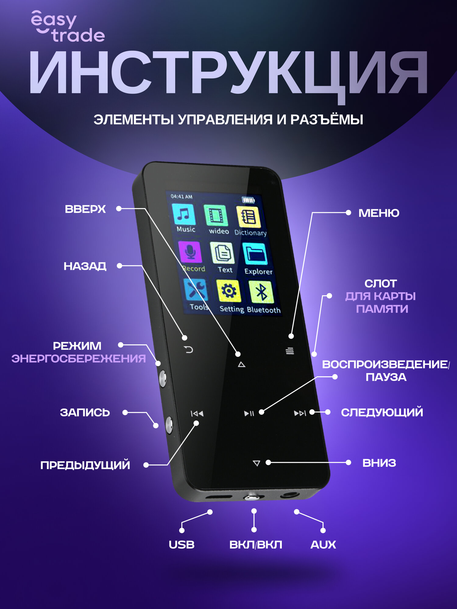 Сенсорный MP3-плеер с поддержкой Bluetooth 5.0 отличается расширенной совместимостью с форматами FLAC и WAV, что обеспечивает качественное lossless-воспроизведение. Устройство оснащено: