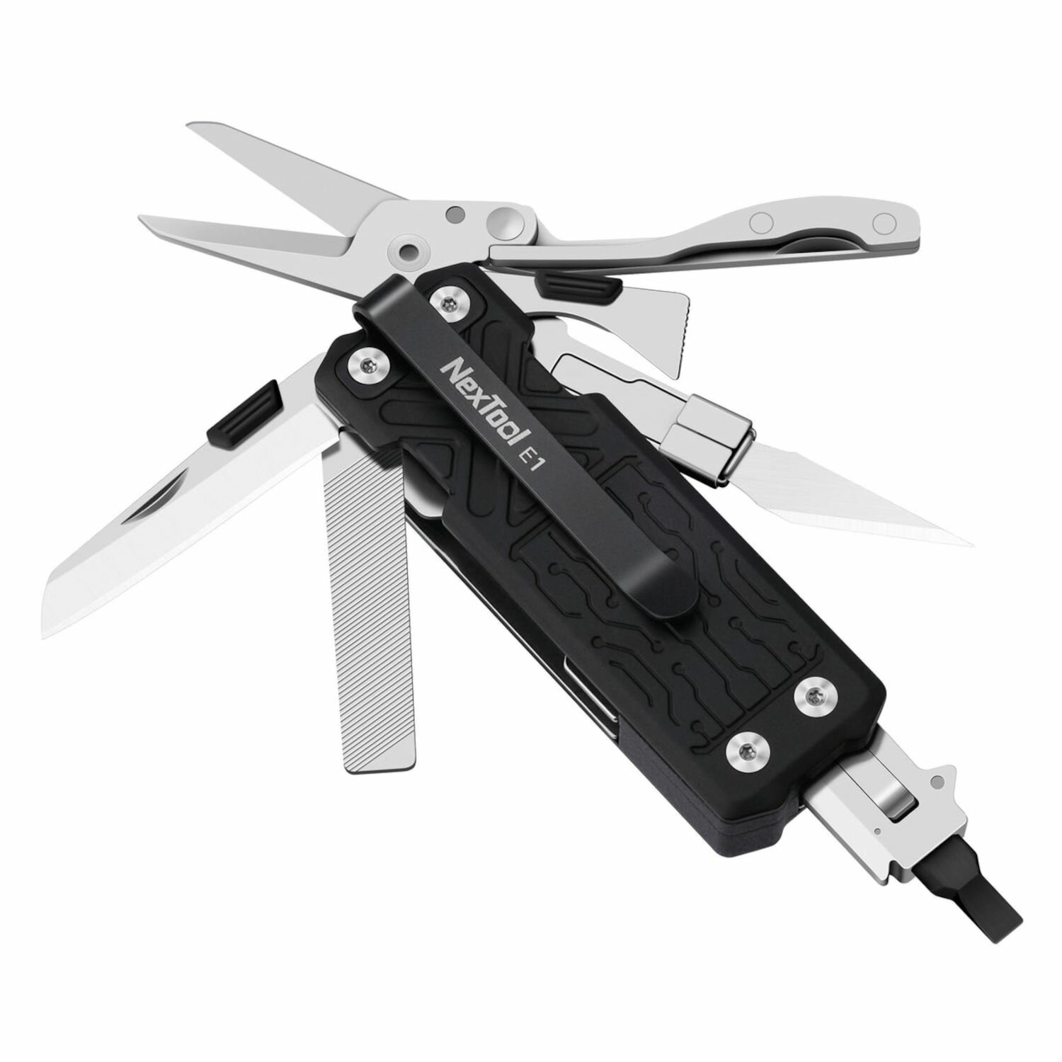 - 10 инструментов в одном: основной нож, ножницы, фонарь (55 люмен), консервный нож, открывалка для бутылок, 3 отвертки разных размеров, гаечный ключ и напильник