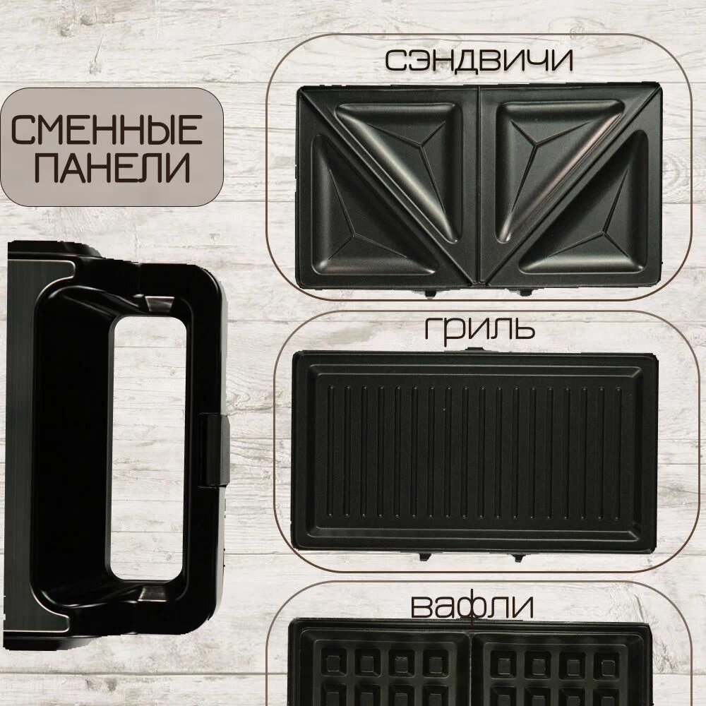 - 4 типа панелей: классический гриль для мяса и овощей, пластины для сэндвичей, рельеф для венских и бельгийских вафель.