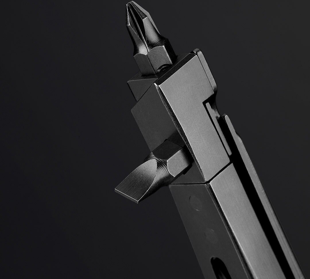 Лезвие ножа изготовлено из нержавеющей стали MarkForged с твердостью 56 HRC. Комбинированная рукоять объединяет алюминиевую раму и ABS-пластиковые накладки для надежного хвата весом 28.5 грамм. Шарнирный узел пассатижей усилен стальным штифтом диаметром 3 мм.