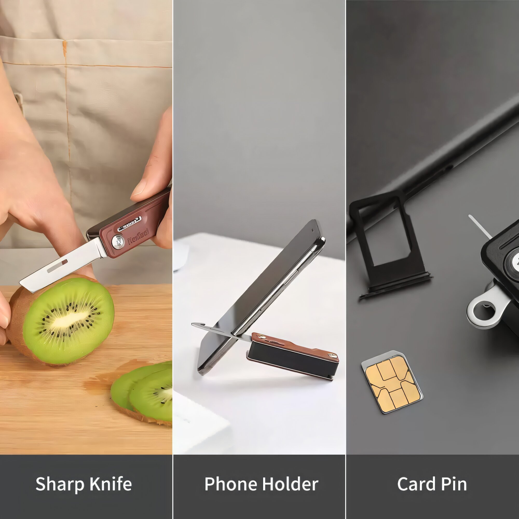 - Четырёхкомпонентная эргономика: нож (длина лезвия 58 мм), мини-ножницы, крестовая отвёртка и открывалка интегрированы в единый каркас