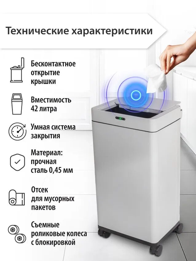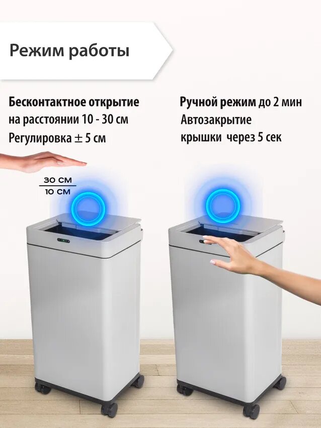 - Режим "Smart Sensor" – крышка открывается при приближении руки на 10 см