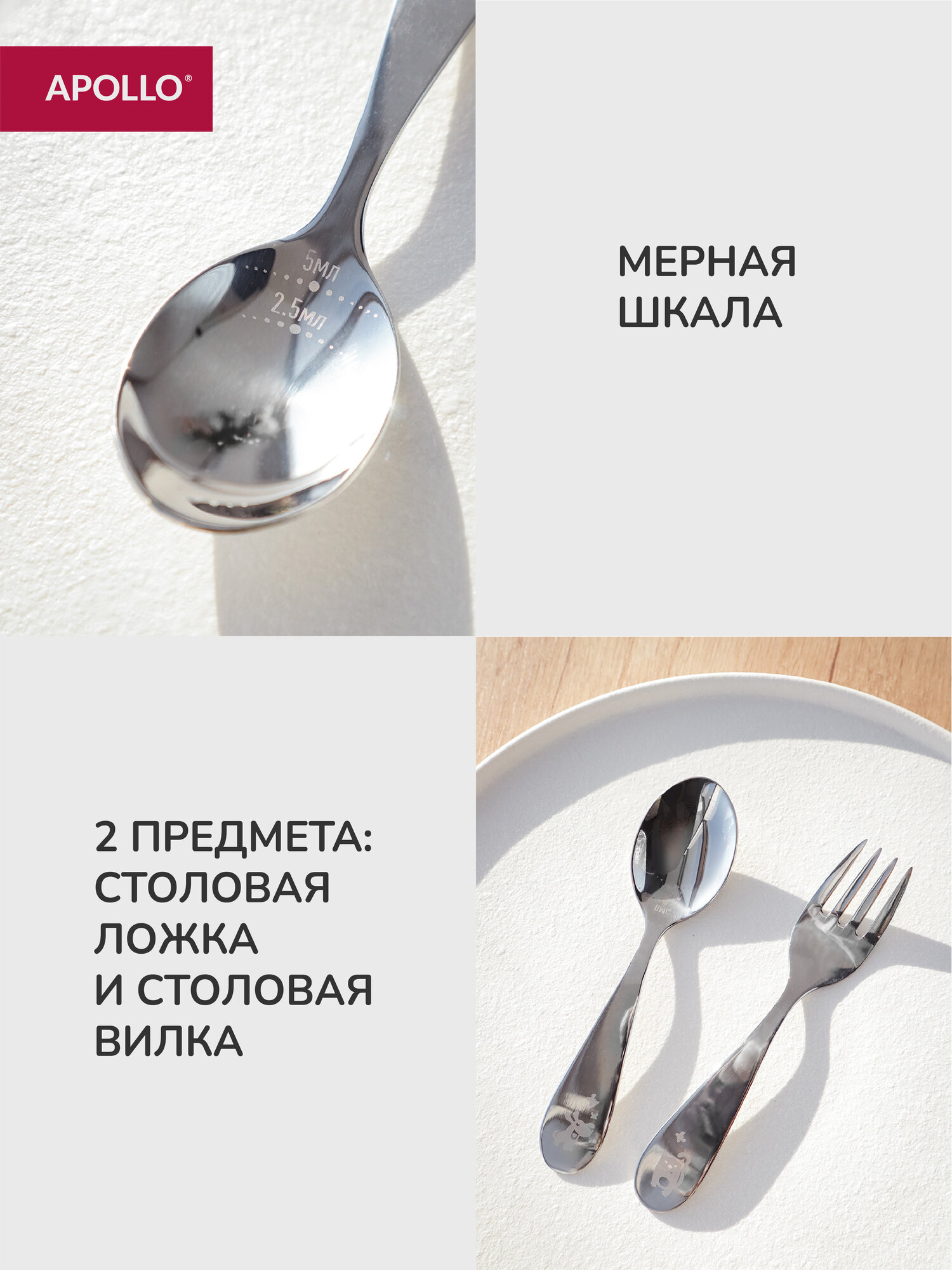 По сравнению с моделью Chicco, вилка Apollo на 12% легче, а ложка имеет шире рабочую поверхность (+5 мм) для удобного зачерпывания каш.